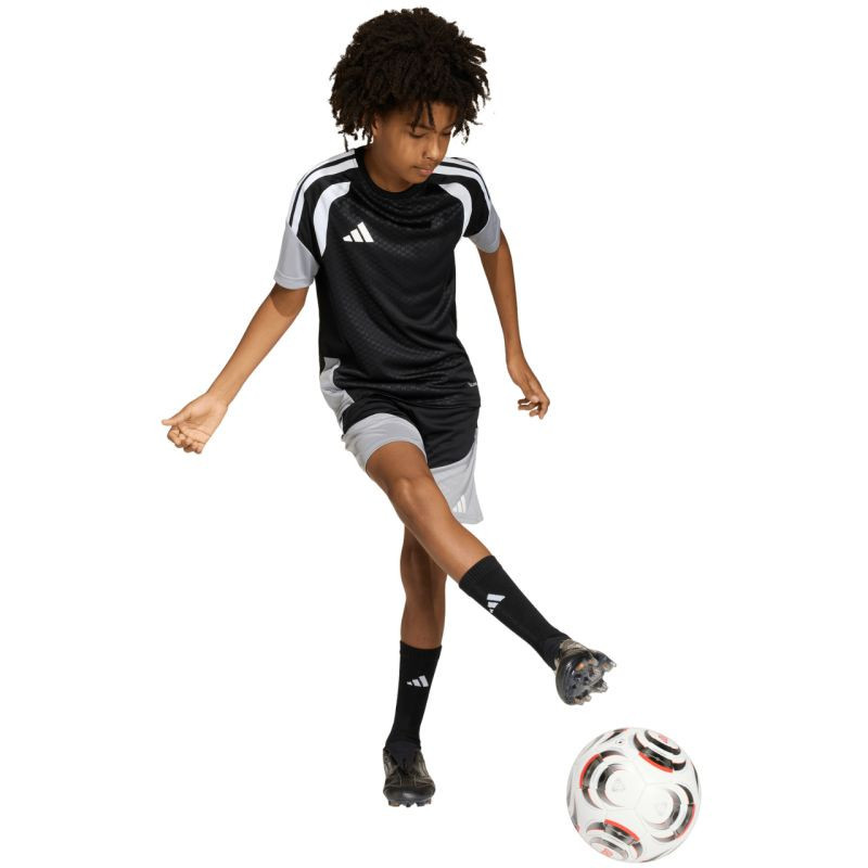 Dětské tréninkové tričko adidas Tiro 26 Competition černo-šedé KA7599 Dětské tričko adidas je ideální na trénink a rozhodující zápasy. regular fit střih. síťované vsadky na hrudi. technologie Climacool absorbuje a odvádí pot. recyklovaná vlákna. decentní logo. pruhy na rukávech. materiál: 100% recyklovaný polyester.