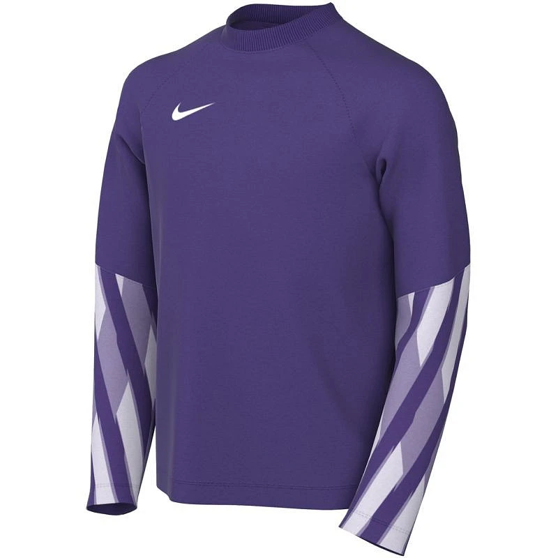 Dětské brankářské tričko Nike Dri-Fit Park V Stadium ve fialové barvě HV8318 507 Dětské brankářské tričko Nike je ideální pro hru, je vyrobeno z rychleschnoucí tkaniny s technologií Dri-FIT, která odvádí vlhkost. Tričko má střih na míru, žebrovaný výstřih, všité rukávy a grafiku na rukávech.