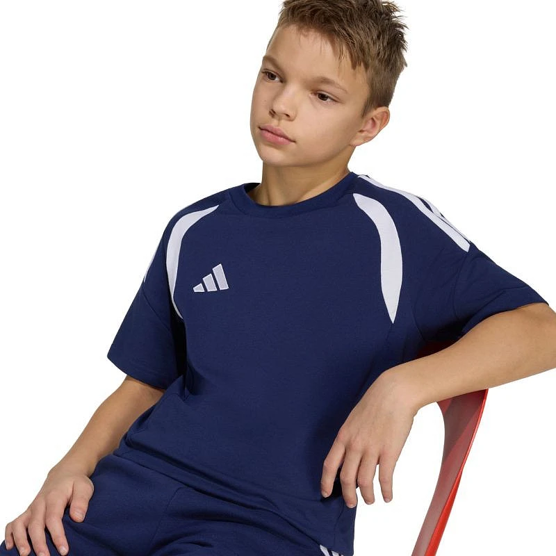 Koszulka dla dzieci adidas Tiro 26 League Tee granatowa JY7225 Koszulka dla dzieci adidas sprawdzi się podczas odpoczynku poza linią boiska. Model z linii Tiro jest inspirowany światem piłki nożnej. Haftowane logo adidas i 3 paski. Kontrastowe wstawki na klatce piersiowej. Miękki, bawełniany materiał. Regularny krój. Materiał: 100% bawełna
