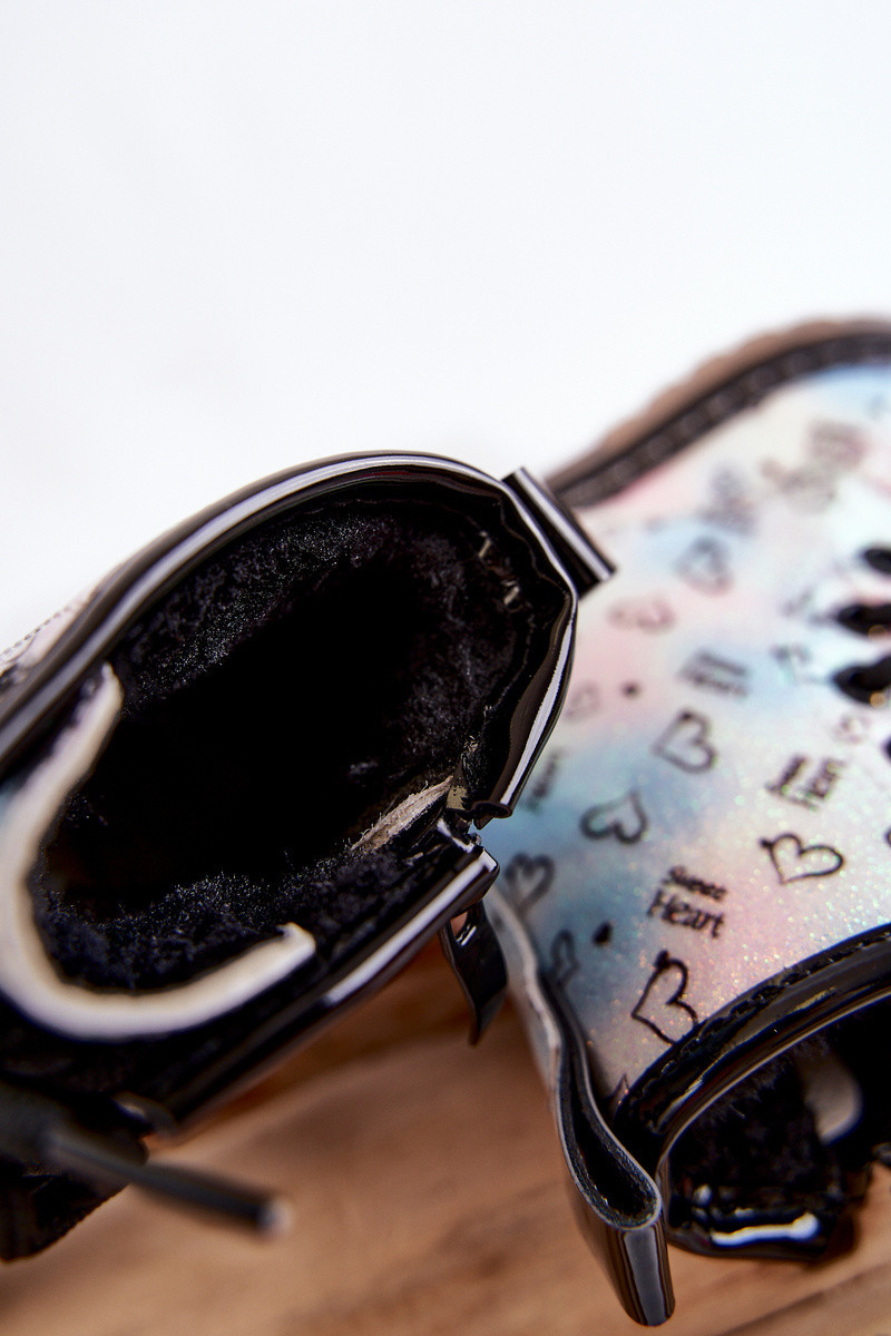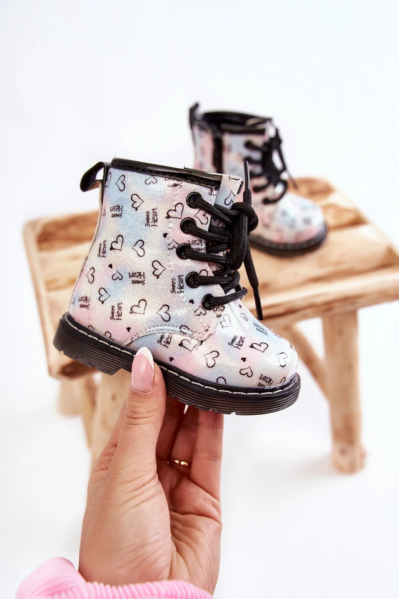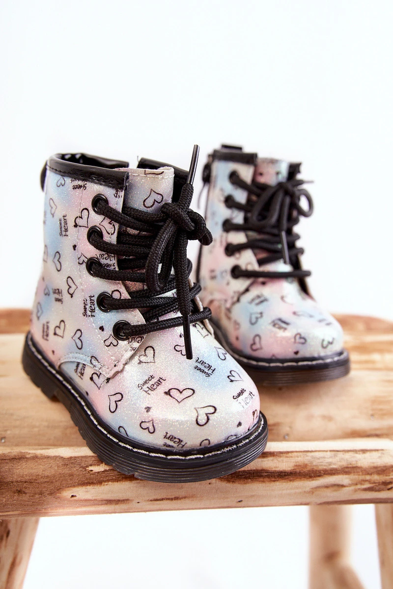Krásné, dívčí kozačky jsou vyrobeny z eko kůže s módním vzorem. Navíc jsou zdobené třpytkami. Kozačky mají zip na boku svršku a klasické šněrování. Kozačky na plochém podpatku a platformě s protiskluzovou podrážkou. Navíc je šitý nití. Uvnitř byly zateplené dekou na boty. Skvělý model pro vaše nejmenší! Při výběru velikosti použijte tabulku velikostí.
