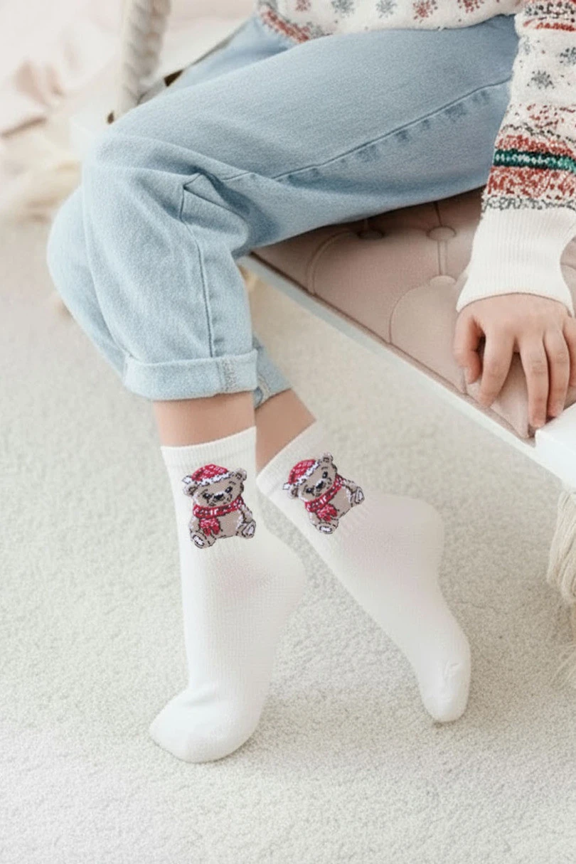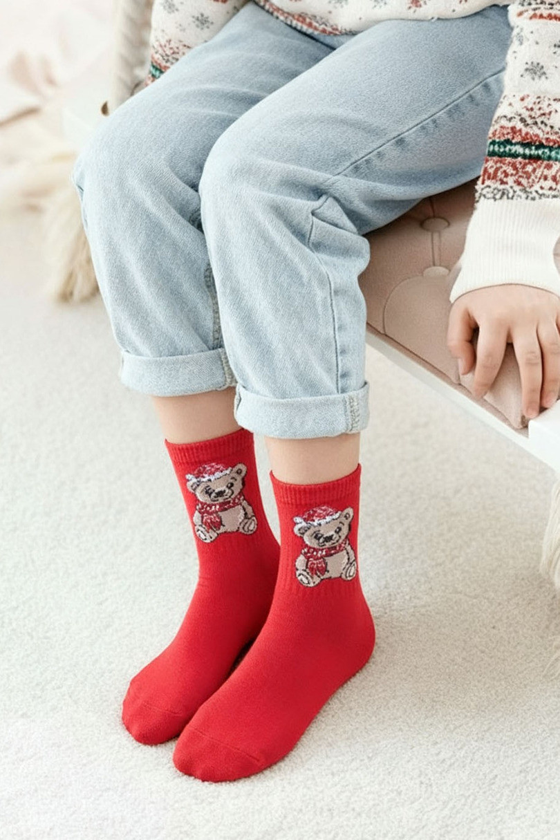 Dětské vánoční ponožky Medvídek jsou měkkým a okouzlujícím doplňkem, který vnese do šatníku těch nejmenších spoustu zimní radosti. Jsou vyrobeny z materiálu příjemného na dotek, zajišťují pohodlí při celodenním nošení a jejich elastická úprava se dokonale přizpůsobí malé nožce, netlačí a nesklouzávají při hře. Veselý motiv vánočního medvídka dodává ponožkám jedinečný půvab a díky němu se skvěle hodí ke každodennímu i svátečnímu oblečení. Je to ideální nápad na praktický a okouzlující dárek.