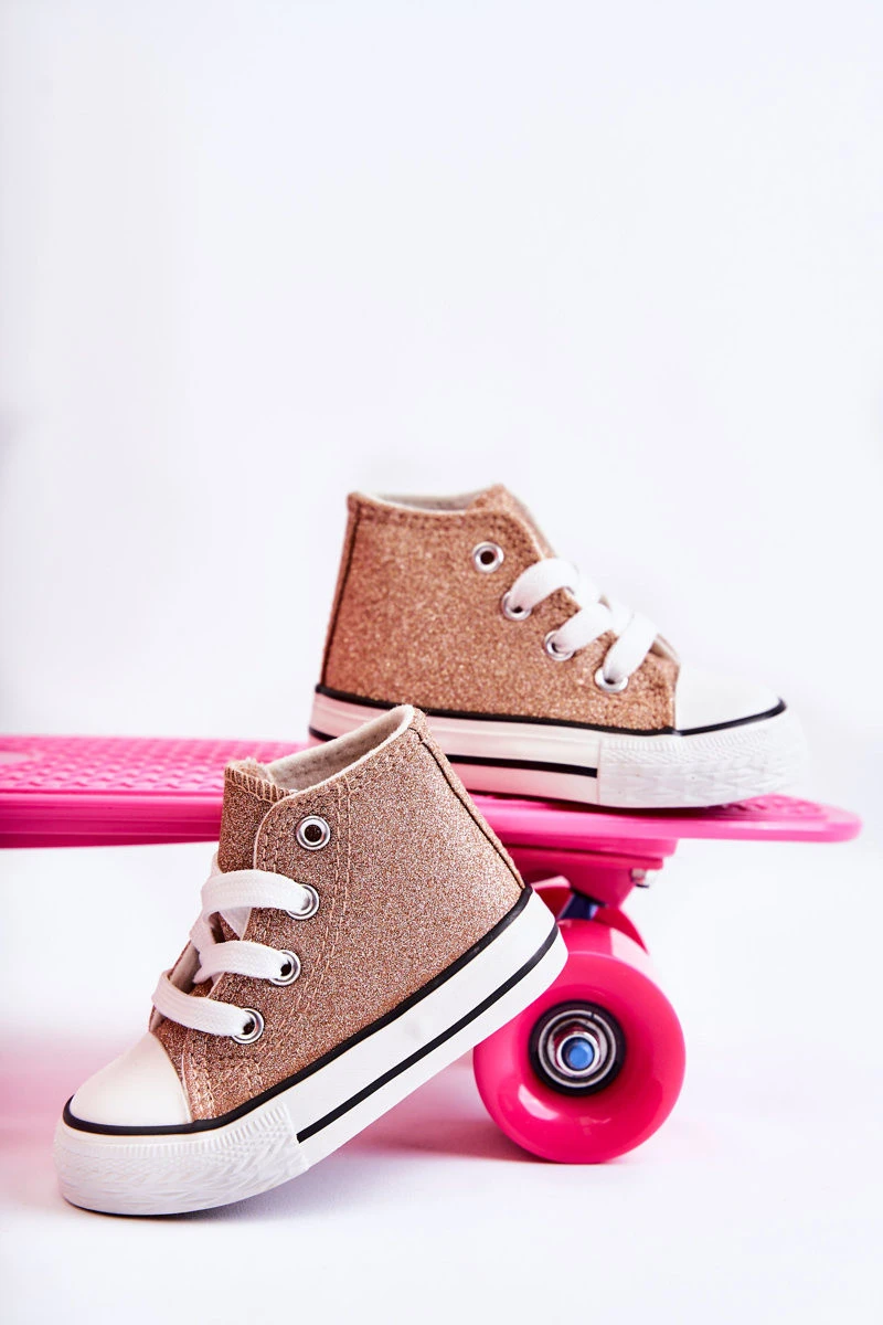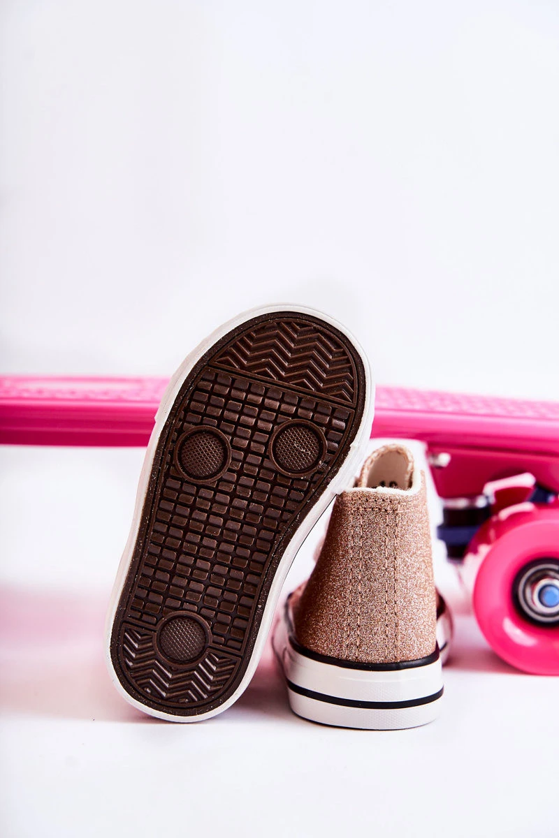 Vysoké dětské tenisky z textilního materiálu. Zdobené třpytkami. Klasická vazba. Špička vyztužená pryžovým materiálem. Měkká a textilní stélka. Gumová podrážka a protiskluzová. Lehké a pohodlné tenisky. Ideální na jarní a letní sezónu. Při výběru velikosti použijte tabulku velikostí.