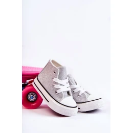 Vysoké dětské tenisky z textilního materiálu. Zdobené třpytkami. Klasická vazba. Špička vyztužená pryžovým materiálem. Měkká a textilní stélka. Gumová podrážka a protiskluzová. Lehké a pohodlné tenisky. Ideální na jarní a letní sezónu. Při výběru velikosti použijte tabulku velikostí.