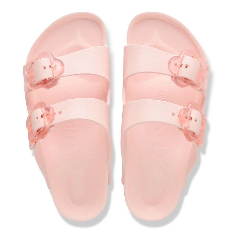 Model BIRKENSTOCK Arizona to prawdziwa klasyka gatunku, która od dziesięcioleci zachwyca swoim ponadczasowym designem. Klapki z dwoma paskami pozwalają utrzymać dziecięcą stopę w idealnej pozycji – nawet podczas najbardziej zwariowanych zabaw! Model w zaprezentowanej tu wersji wyróżnia się fantazyjną, kwiatową klamrą z odpornego na rdzę tworzywa sztucznego. Buty te są wzorowane na oryginalnych klapkach z korka i wykonane z niezwykle lekkiej, elastycznej pianki EVA. Pianka EVA jest wysokiej jakości, bezzapachowa i wolna od zanieczyszczeń; amortyzuje, jest wodoodporna i przyjazna dla skóry. Dzięki temu obuwie doskonale sprawdzi się na plaży, w ogrodzie i na placu zabaw.