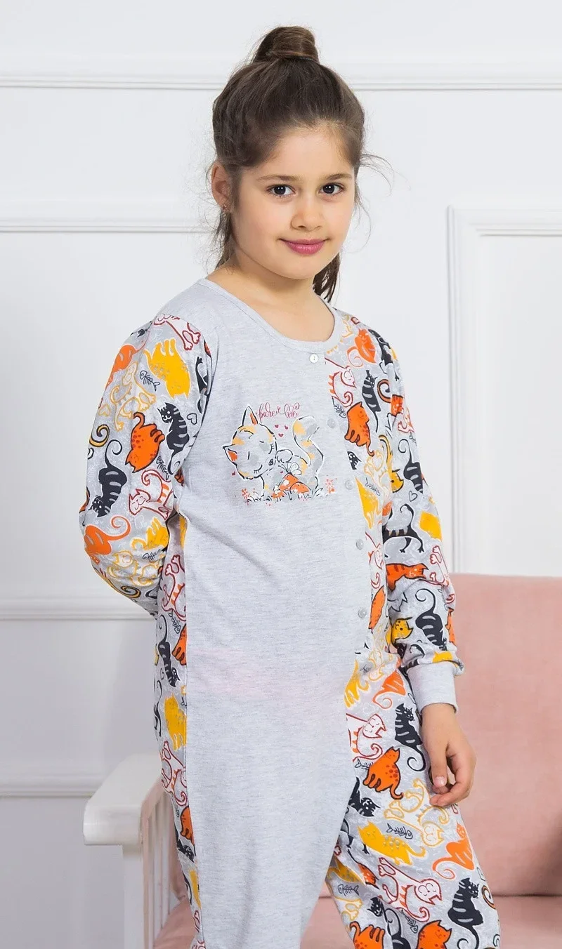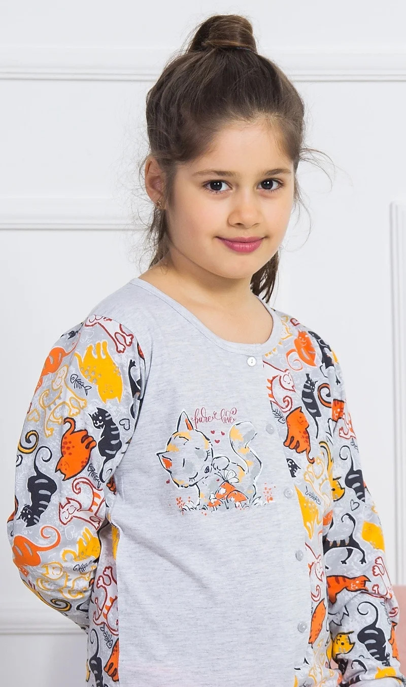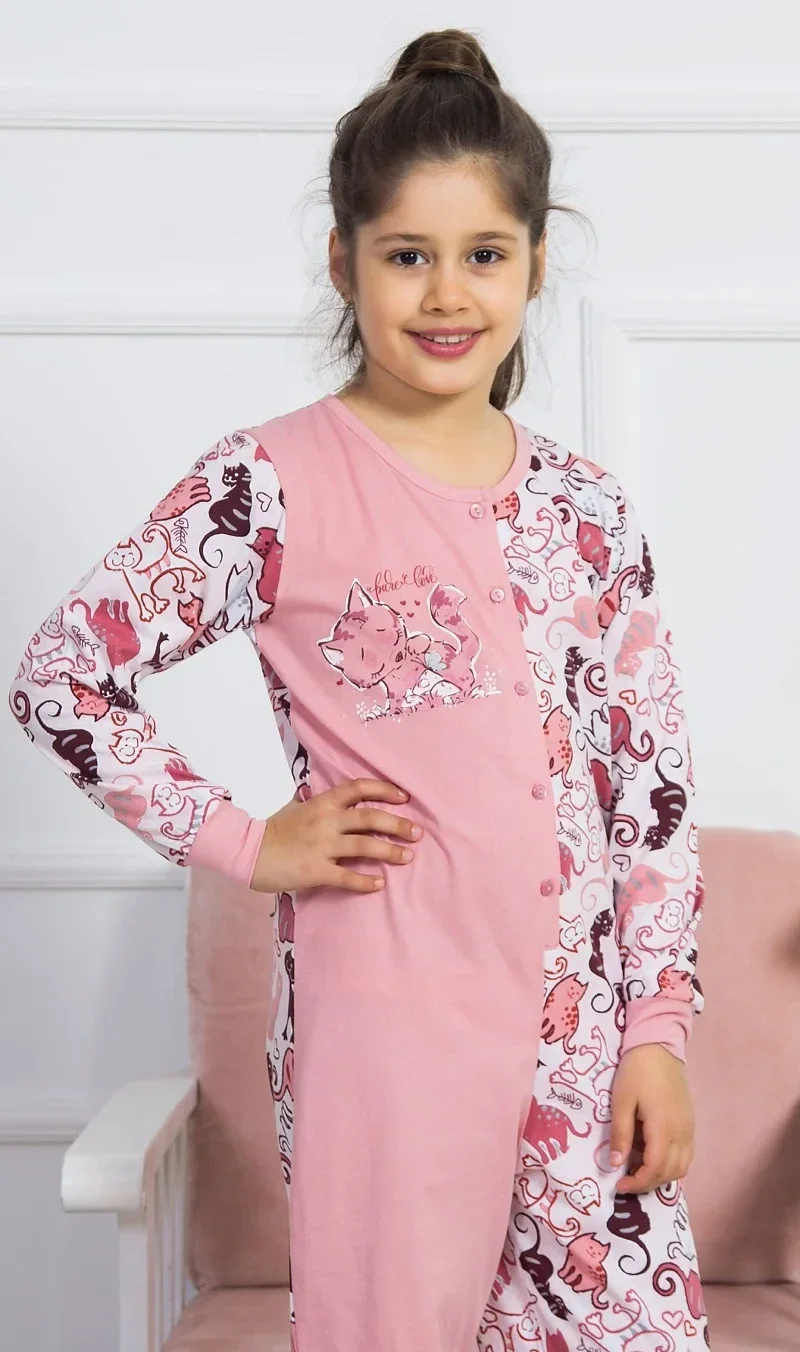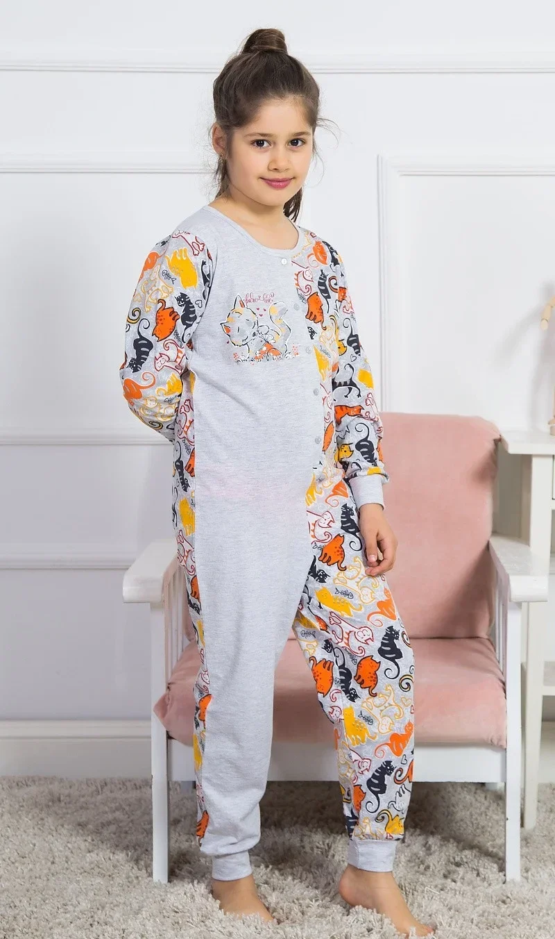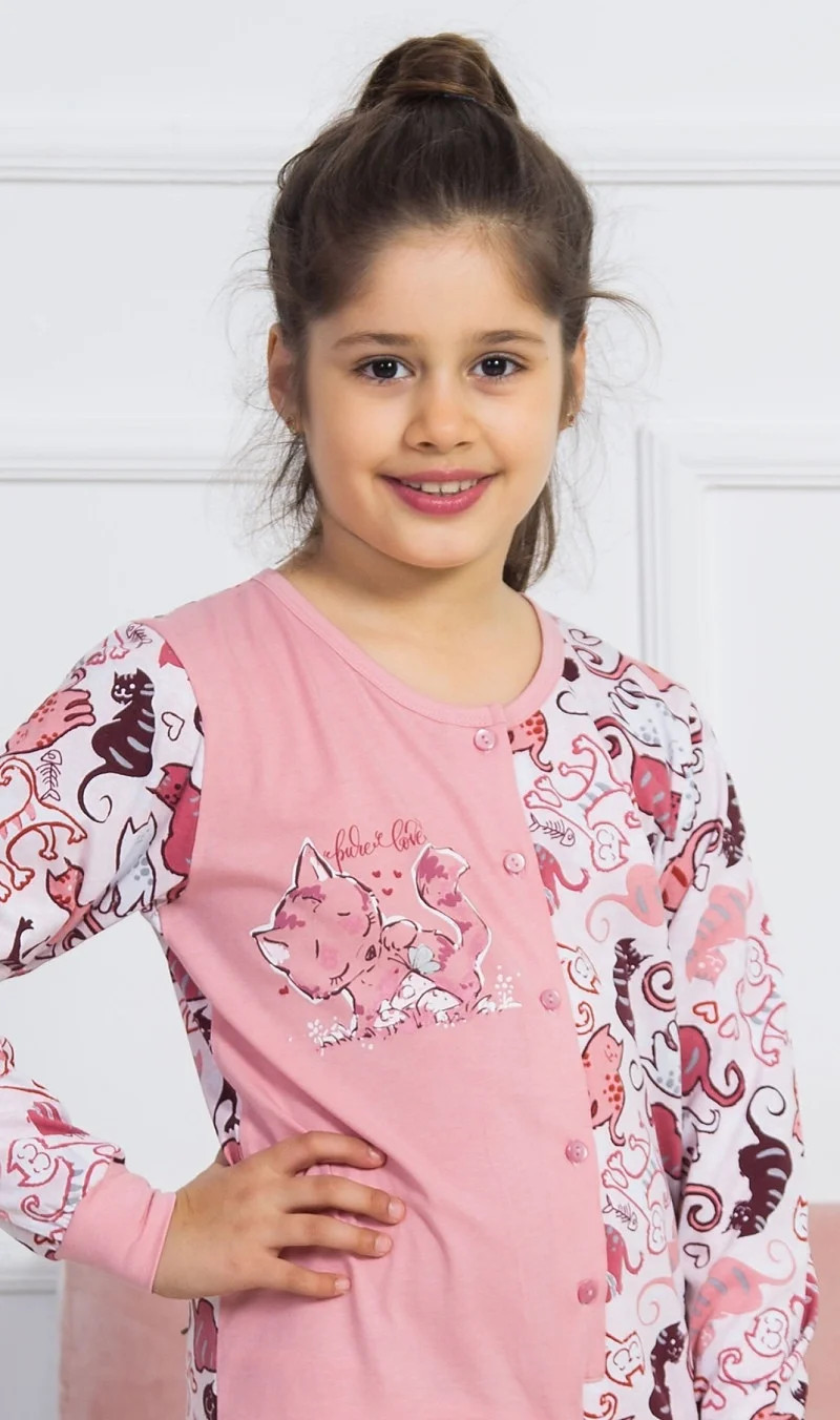 Dětský overal Kočky. Overal je celopropínací - z jedné strany zdobený obrázkem koťete, z druhé strany celoplošným potiskem koček. Dlouhé nohavice jsou ukončeny elastickými lemy. Použitý materiál je poddajný a příjemný na dotek. Obsah bavlny u starorůžové varianty je 100%, u šedé 70%.