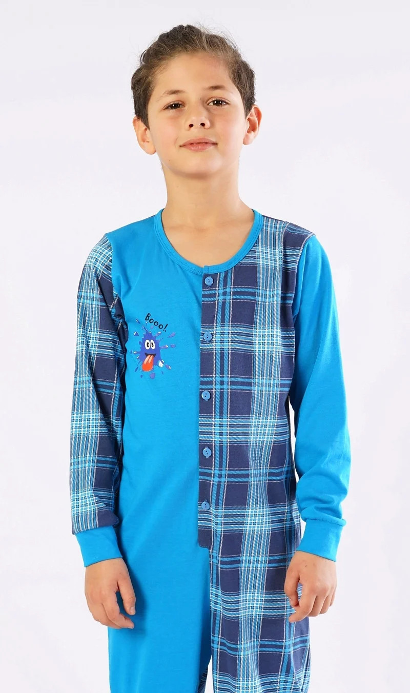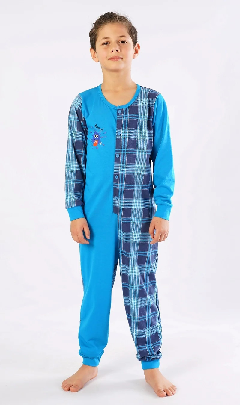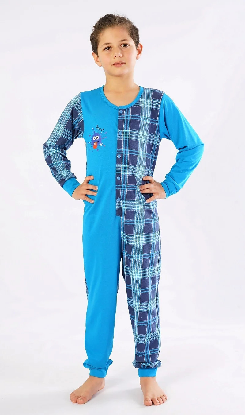 Dětský bavlněný overal Matěj. Overal je celopropínací - z jedné strany zdobený obrázkem bubáčka a nápisem 'Booo', z druhé strany potištěný kostkou. Dlouhé nohavice jsou ukončeny elastickými lemy. Bavlněný materiál je poddajný a příjemný na dotek.
