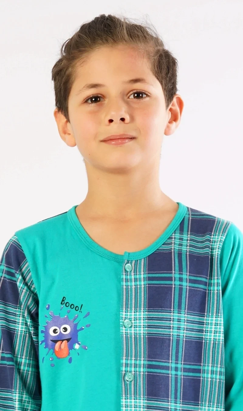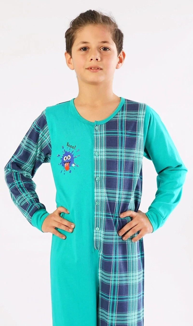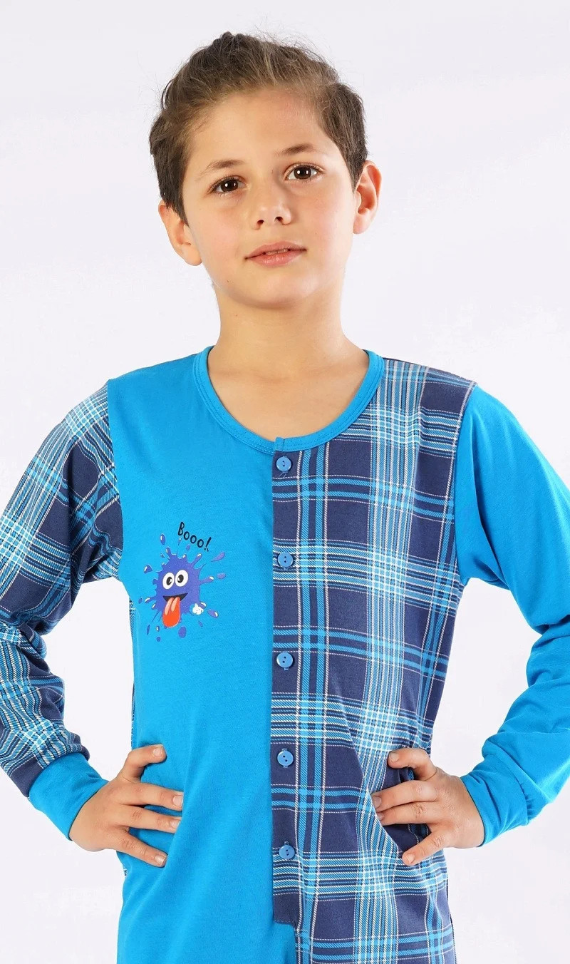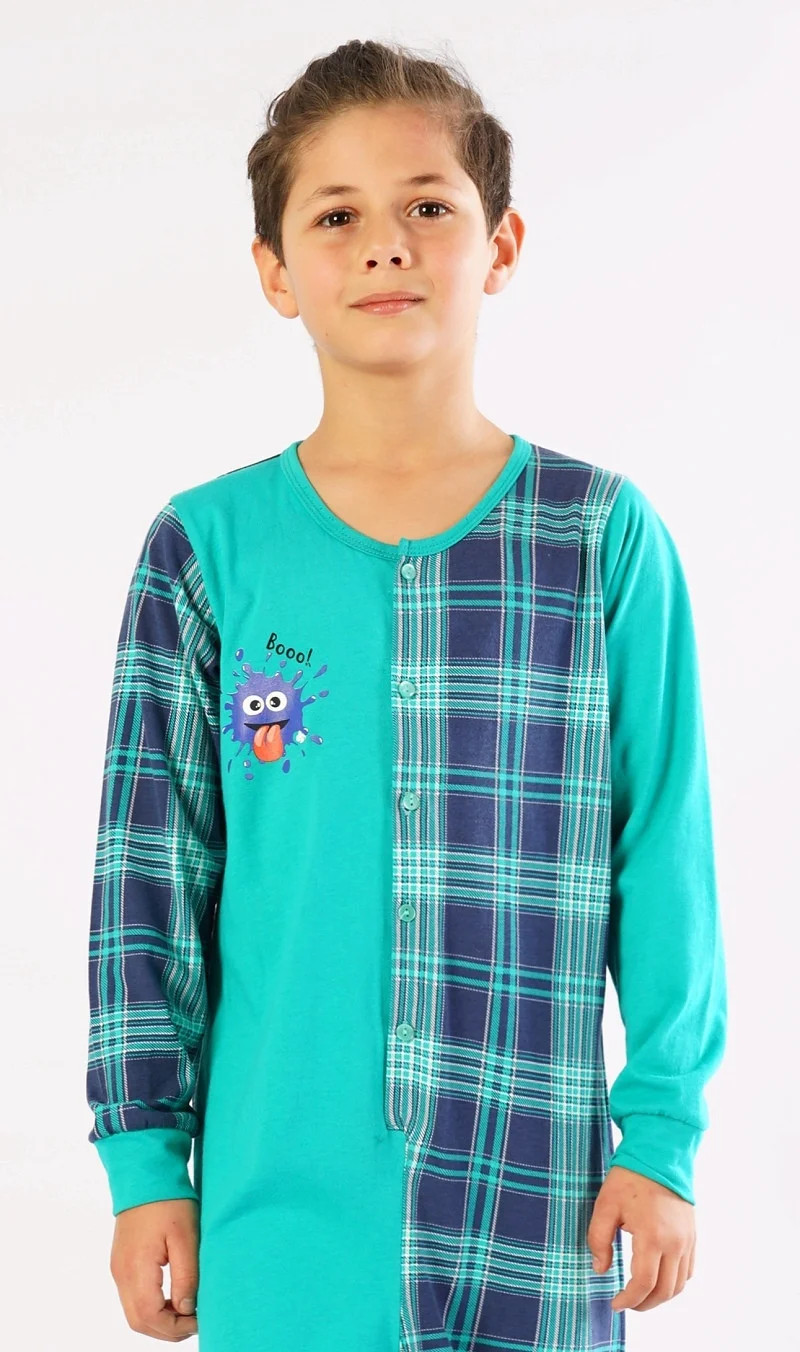 Dětský bavlněný overal Matěj. Overal je celopropínací - z jedné strany zdobený obrázkem bubáčka a nápisem 'Booo', z druhé strany potištěný kostkou. Dlouhé nohavice jsou ukončeny elastickými lemy. Bavlněný materiál je poddajný a příjemný na dotek.