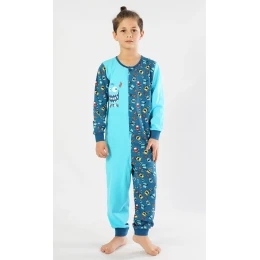 Dětský overal Monster. Dětský celopropínací overal se pohledové skládá z jednobarevné a celopotištěné části. Na jednobarevné je roztomilá příšerka s otevřenou tlamou, ze které kouká nápis Hungry monster. Celopotištěná část je plná dalších příšerek. Rukávy a nohavice overalu jsou zakončeny elastickými panty. Použitý materiál je jemný a poddajný na dotek. Pyžamo je vhodné i na denní nošení.