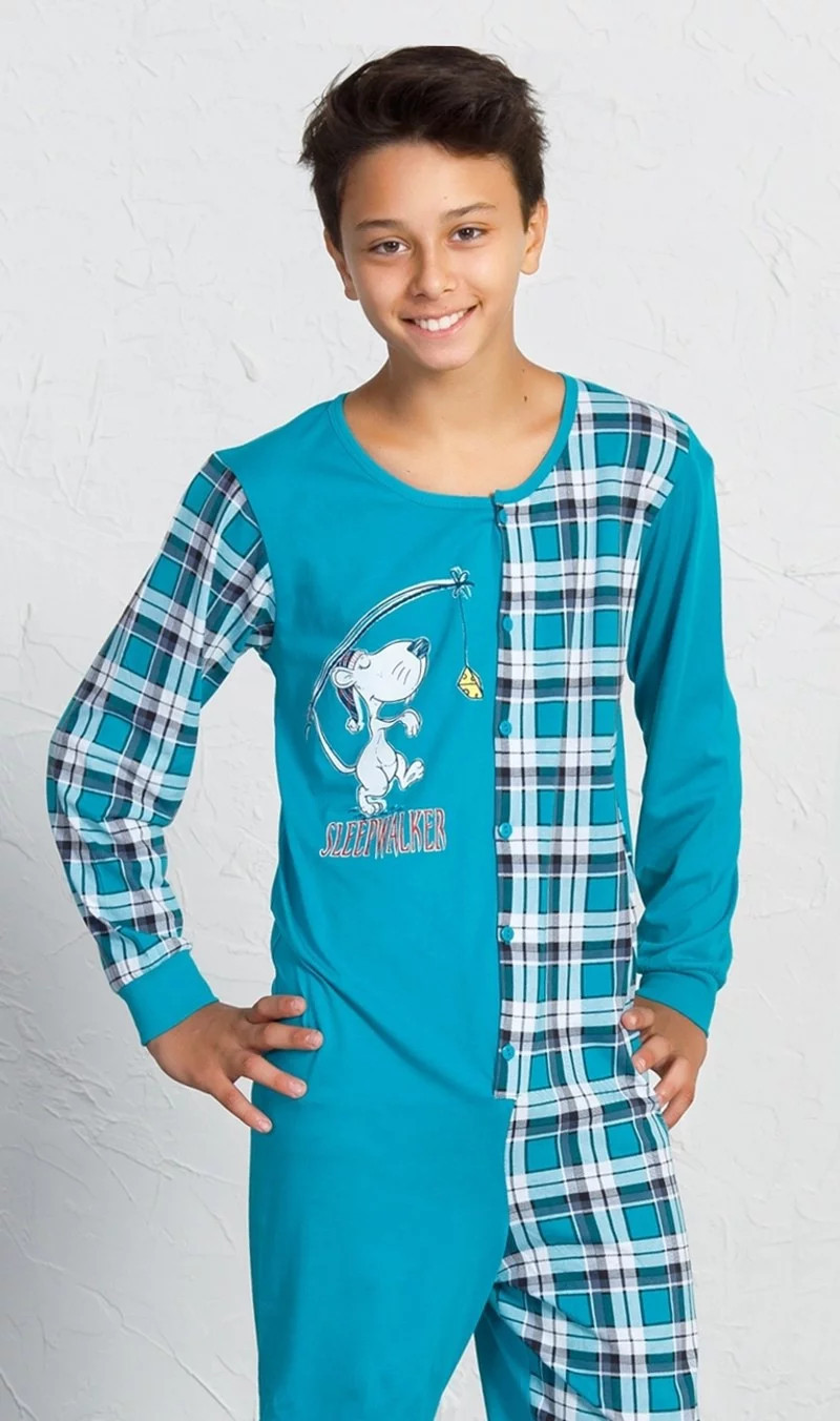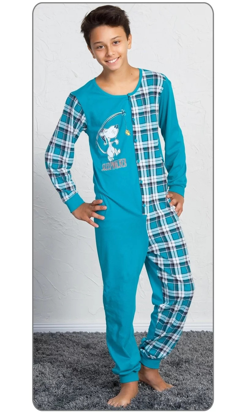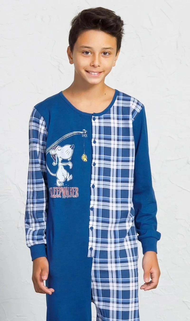 Dětský overal Sleepwalker. Overal je celopropínací z jedné strany zdobený potiskem myšáka, z druhé strany celoplošnou kostkou. Dlouhé nohavice jsou ukončeny elastickými lemy. Bavlněný materiál je poddajný a jemný na dotek. Pyžamo je vhodné i na denní nošení.