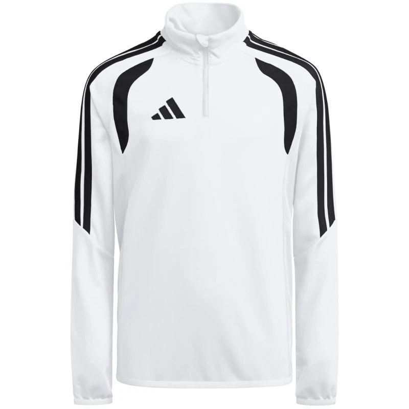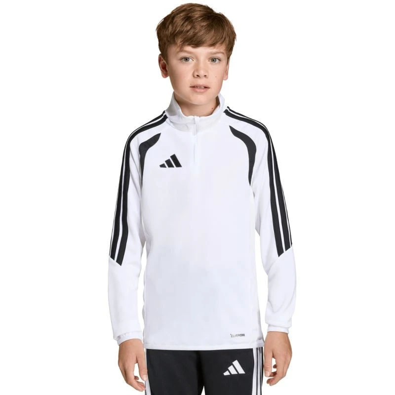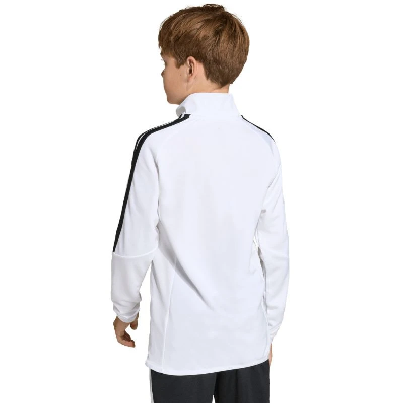 Dětská fotbalová mikina adidas Tiro 26 League Training Top bílá KC3696 Tato dětská fotbalová mikina adidas je ideální na trénink. Zakončená nášivkou na ochranu brady, zapínání na krátký zip. Přizpůsobený střih. Technologie Climacool je funkční řešení, které vás udrží v chladu a suchu a umožní vám soustředit se na hru. Spodní část a manžety zakončené elastickým lemováním. Kontrastní síťované vsadky. Pruhy na rukávech. Jemné logo na hrudi. Materiál: 100% recyklovaný polyester.