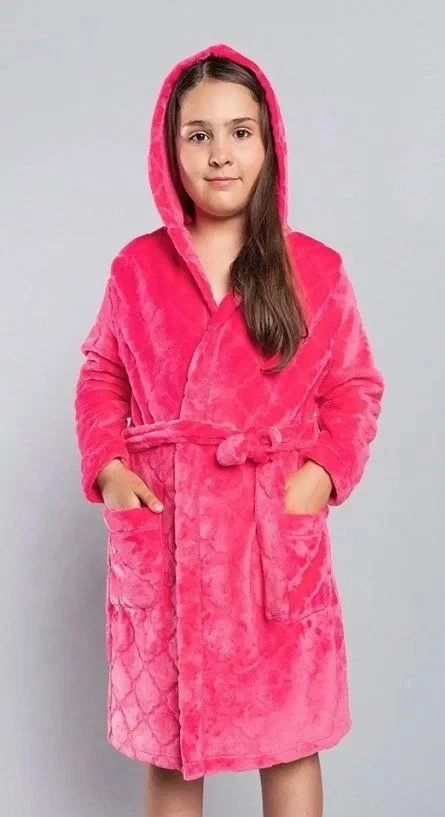 Dívčí župan Lena ITALIAN FASHION - růžová barva - vyrobený z velmi kvalitního protlačovaného materiálu - s dlouhými rukávy - zavazování na pásek - na bocích jsou kapsy - s kapucí - délka nad kolenaMateriálové složení: 100% polyester