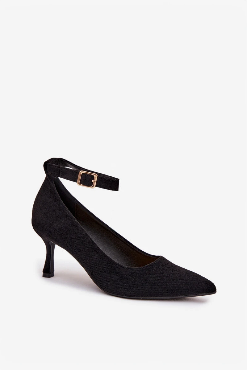 Podpatky – dámské lodičky vyrobené z měkké ekologické semiše. Model zaujme klasickým střihem s špičatým noskem, který opticky zeštíhluje nohy a dodává siluetě lehkost. Boty se zapínají kolem kotníku nastavovací páskou s přezkou, která krásně zvýrazní nohu a zároveň zajišťuje stabilitu a pohodlí při nošení. Tyto lodičky jsou ideální jak pro večerní outfity, tak pro elegantní každodenní kombinace.