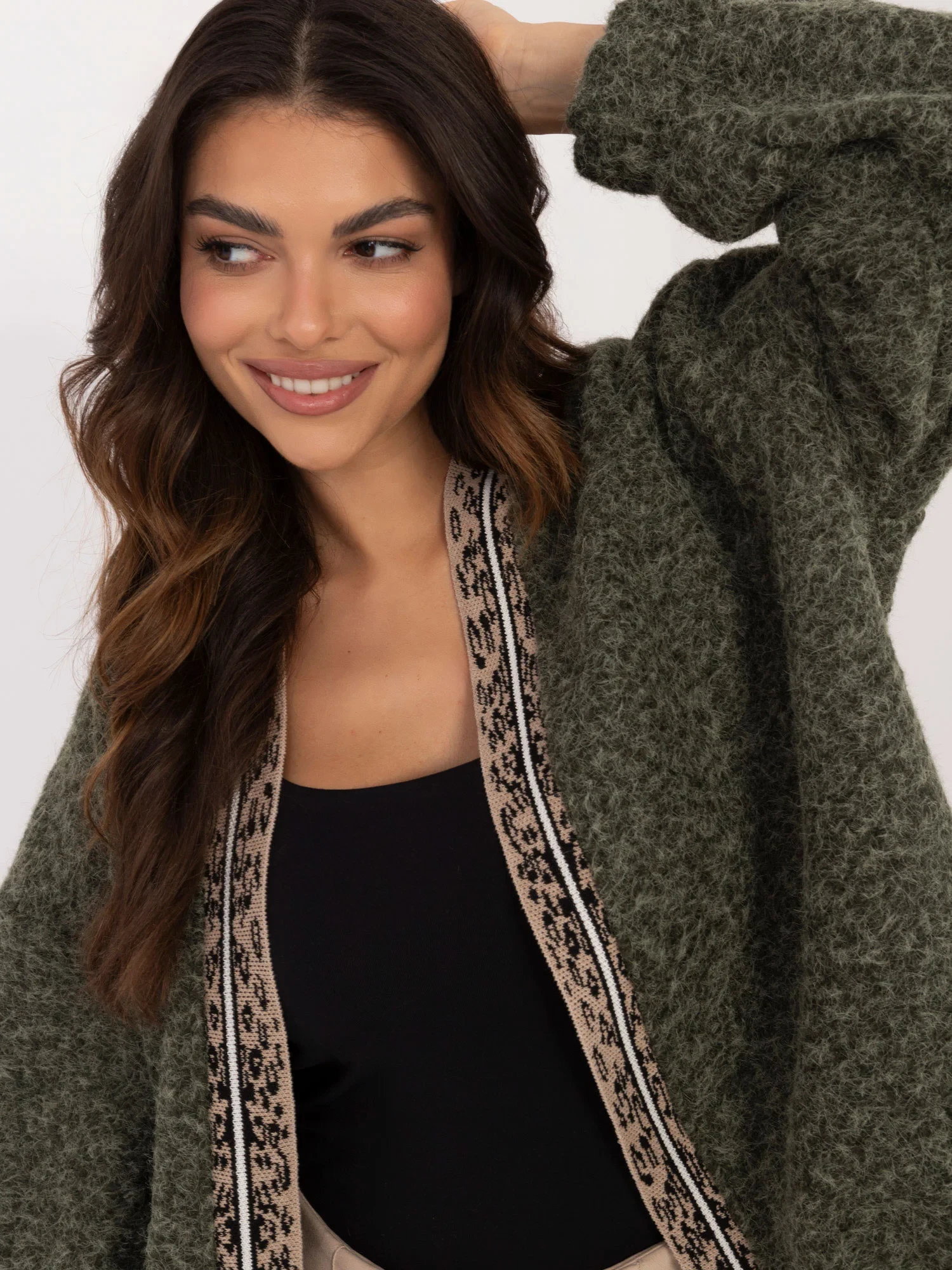 Wymiary swetra w rozmiarze one size mierzone na płasko: szerokość pod pachami - 68 cm, długość całkowita - 68 cm, długość rękawa - 61 cm..