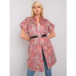 Červený kabát s páskem a kapsami.