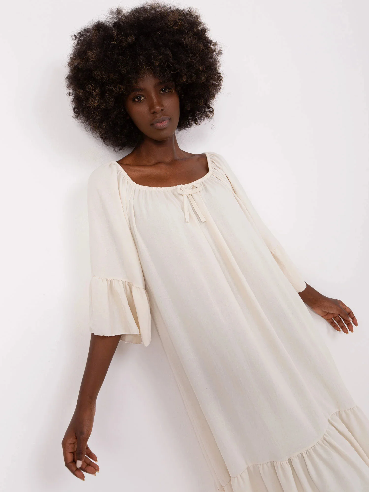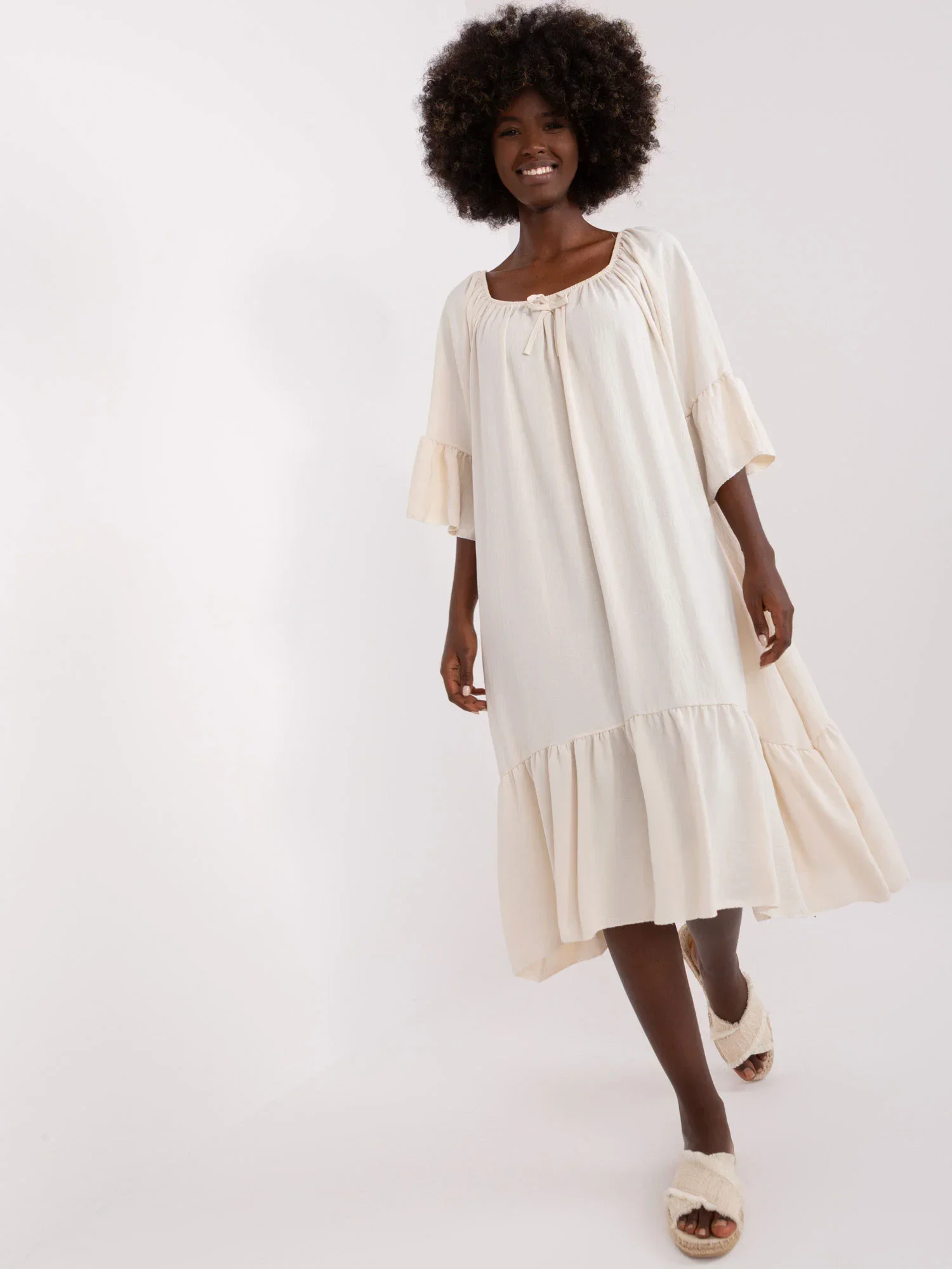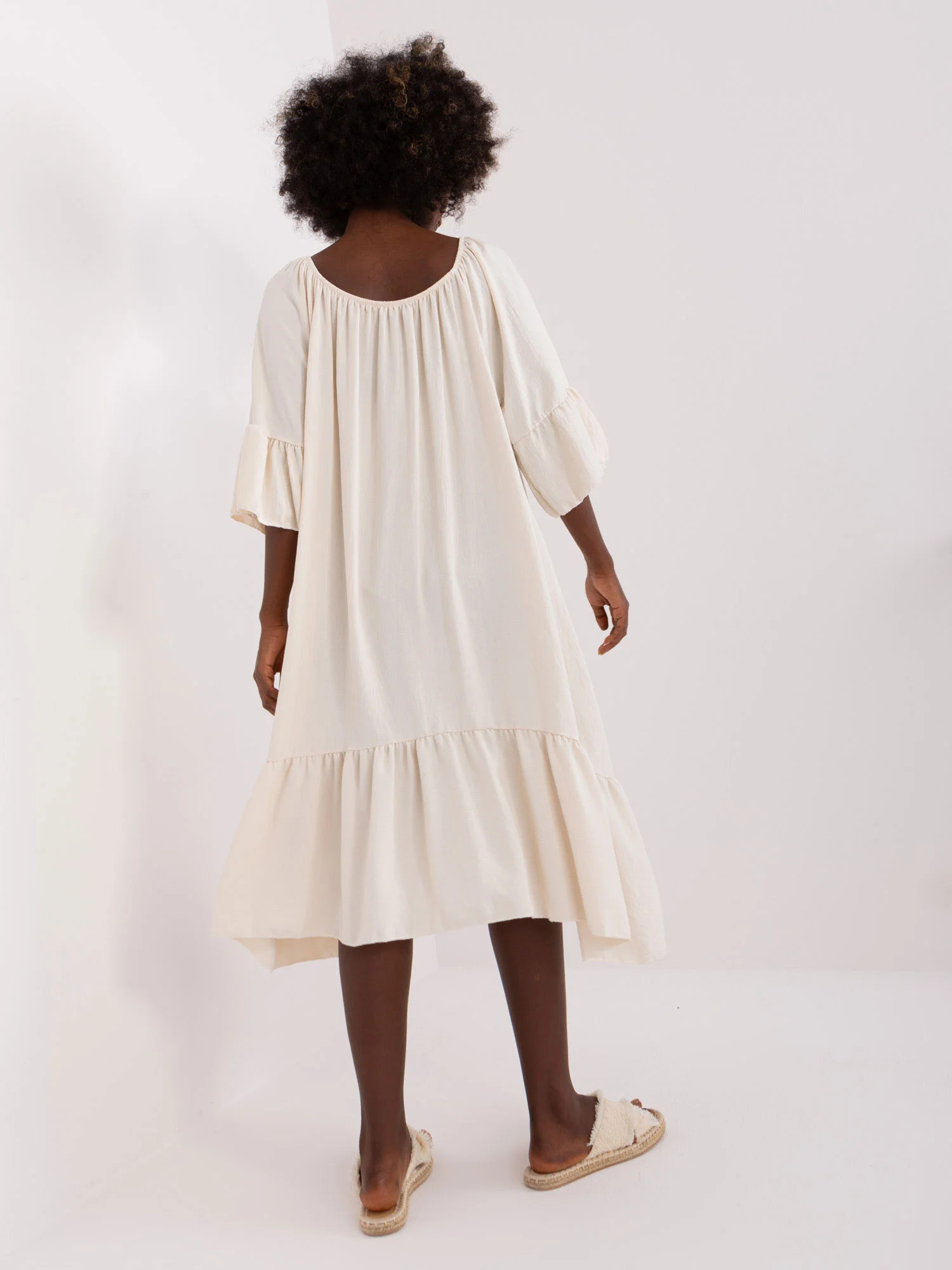 Světle béžové šaty s volánkem a 3/4 rukávy .