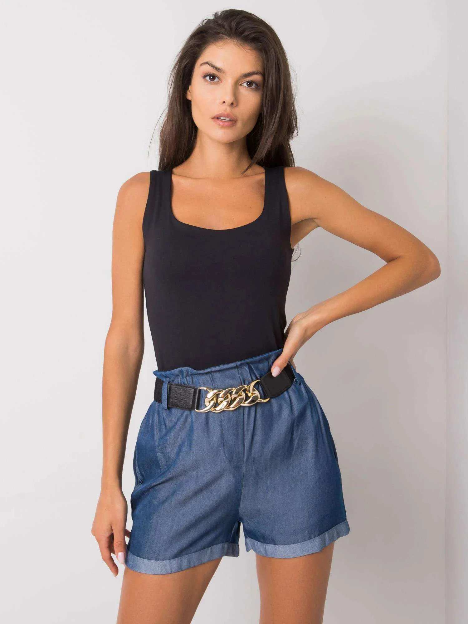 Tmavě modré šortky s ohrnutými nohavicemi.