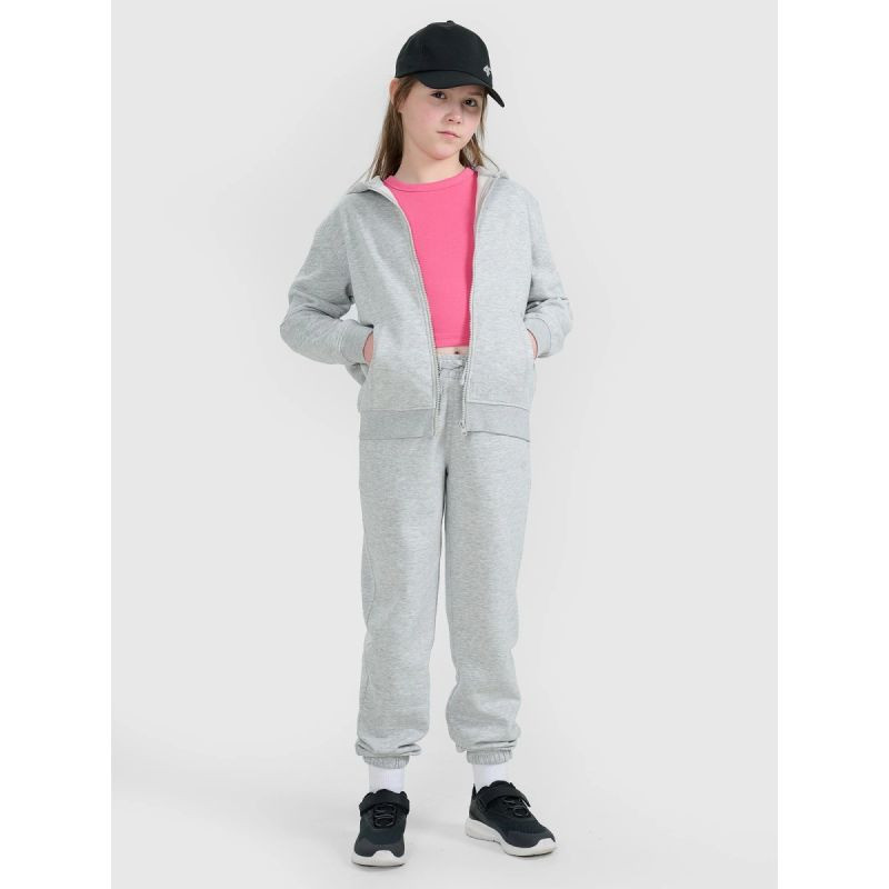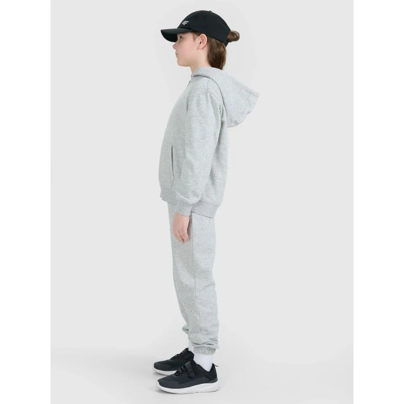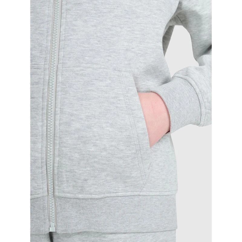 Ta rozpinana bluza dziewczęca 4F została zaprojektowana z myślą o codziennym komforcie i pełnej swobodzie ruchów. Krój oversize zapewnia luźne, wygodne ułożenie na sylwetce, a dzianina single jersey o gładkiej powierzchni gwarantuje elastyczność i wysoki komfort noszenia. Wykonana w 79% z bawełny oraz 21% z poliestru, łączy miękkość, trwałość i odporność na zużycie. Jednostronnie czesane wnętrze zapewnia dodatkowe ciepło, co sprawia, że bluza świetnie sprawdza się w chłodniejsze dni. Zintegrowany kaptur, mankiety i dół ze ściągaczem oraz 2 otwarte kieszenie boczne zwiększają funkcjonalność. Zapinana na jednokierunkowy zamek, to idealny wybór na co dzień, do szkoły czy aktywności na zewnątrz.