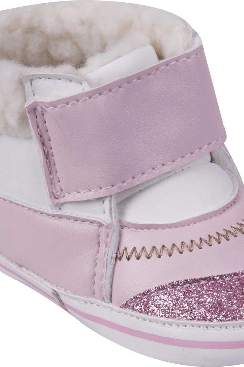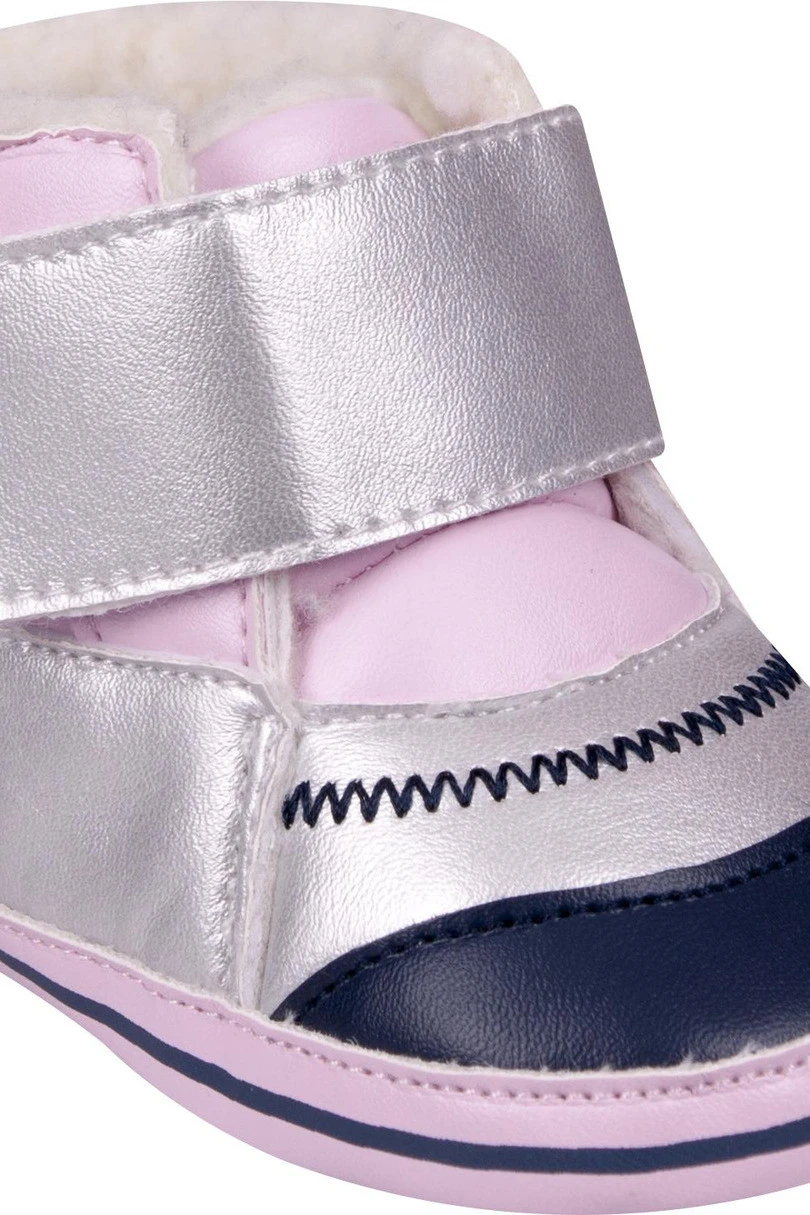 Dívčí boty, kojenecký designór tenisky z lesklé látky, s nadýchaným zateplením a zapínáním na suchý zip.