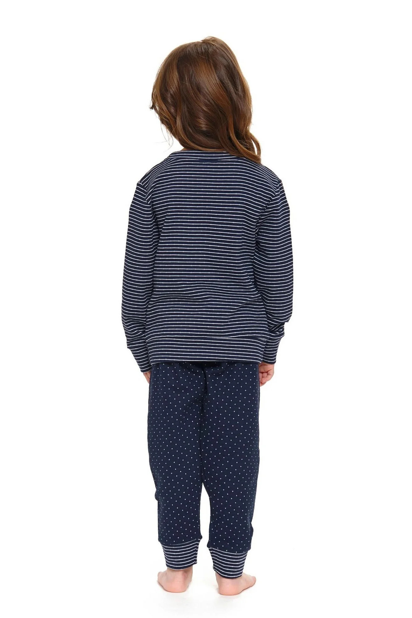 Dívčí pyžamo 5255 plus Doctornap - tmavě modrá barva - vyrobené z velmi kvalitní a příjemné bavlny - pruhované tričko s dlouhými rukávy - na přední straně ozdobené potiskem - dlouhé tamvé kalhoty - certifikát OEKO-TEX Standard 100