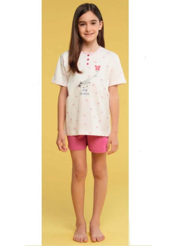 Dívčí pyžamo od italské značky Karelpiu ze 100% bavlny. Pyžamo se skládá ze dvou dílů, trička a kraťasů. Vrchní díl s krátkým rukávem má zdobený kulatý dekolt s légou a 3 knoflíky. Celoplošně má potisk srdíček a malý obrázek na přední straně. Spodní díl má v pase gumu a je jednobarevný. Pyžamo je ze 100% bavlny, velmi jemné a příjemné na dotek