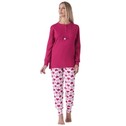 Dívčí bavlněné pyžamo značky Karelpiu. Pyžamo se skládá z trička s dlouhým rukávem, okolo krku je kulatý výstřih a léga se třemi knoflíky, pod kterou je natištěná aplikace. Rukávy jsou ukončené do lemu ze stejného materiálu, jako je tričko. Kalhoty jsou v pase do pružné obšité gumy. Pyžamo je ušité z příjemné hřejivé bavlny.