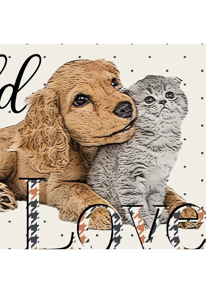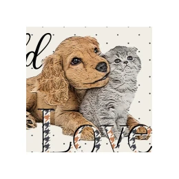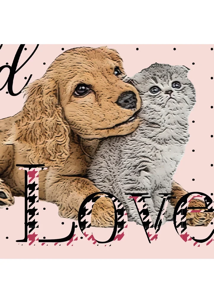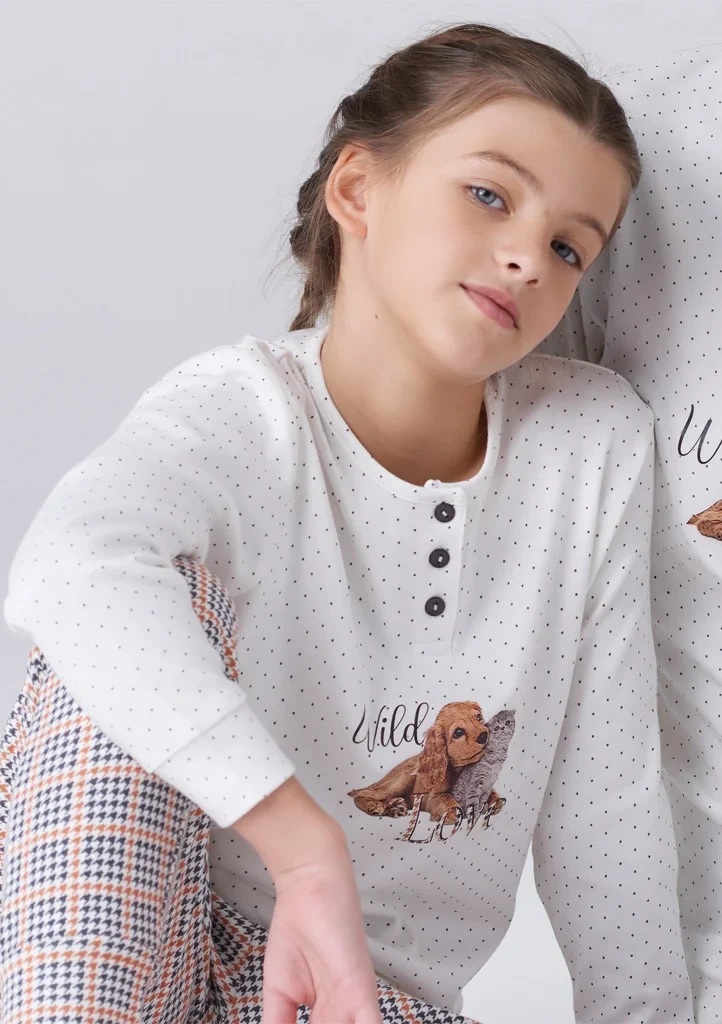 Dívčí bavlněné pyžamo značky Karelpiu. Pyžamo se skládá z trička s dlouhým rukávem, kde na přední straně je natištěná aplikace pejska a kočičky. Okolo krku je kulatý výstřih a léga s třemi knoflíky. Kalhoty jsou v pase do pružné obšité gumy, nohavice jsou ukončené do lemu ze stejného materiálu jako jsou kalhoty. Pyžamo je ušité z jemné, hřejivé bavlny.
