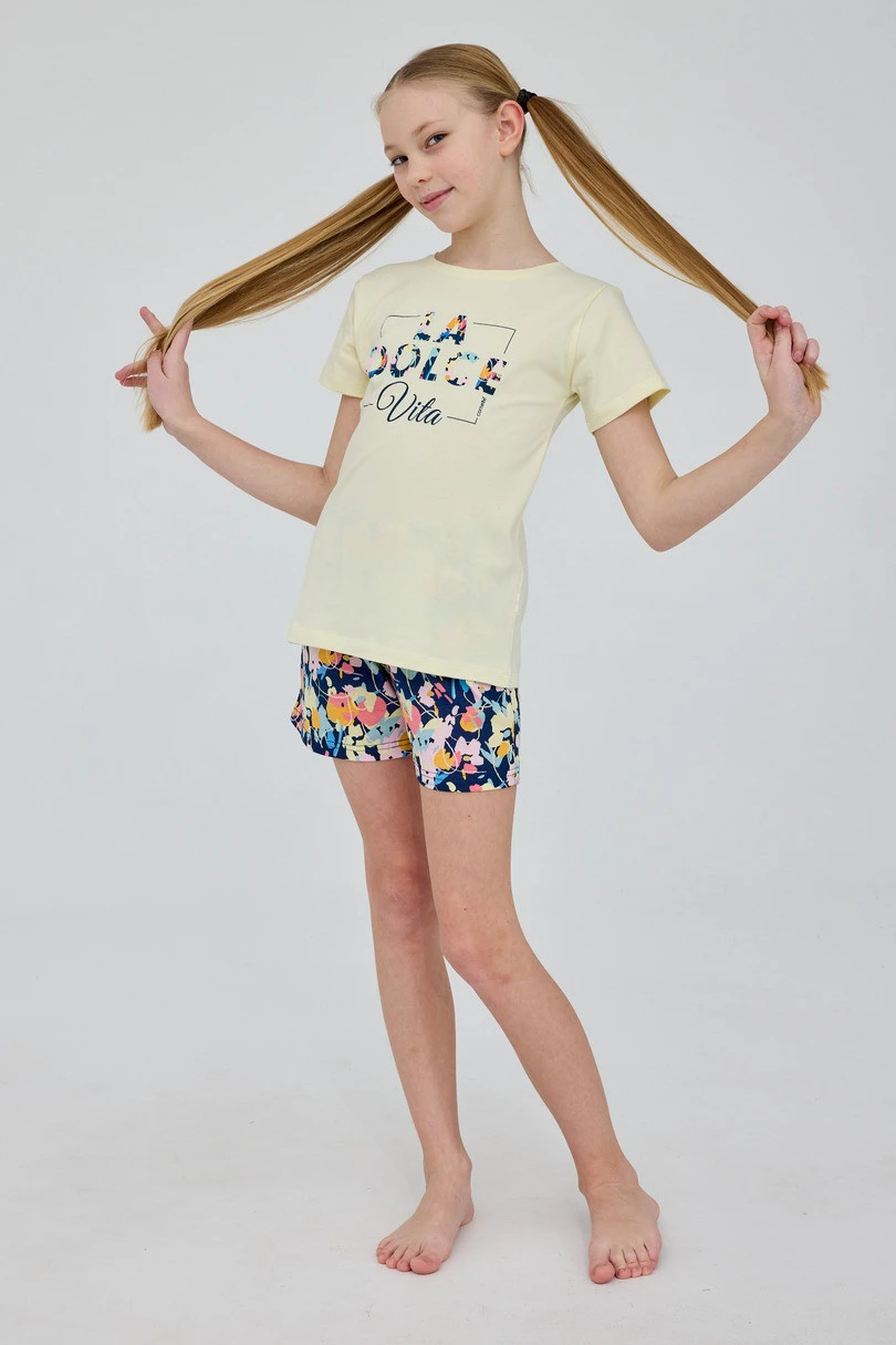 Bluzka z krótkim rękawem i klasycznym, półokrągłym dekoltem doskonale układa się na sylwetce, a krótkie, wzorzyste spodnie dodają całości lekkości i radosnego charakteru. Elastyczna gumka w pasie, obszyta bawełną, gwarantuje wygodne dopasowanie bez ucisku. Piżama DOLCE VITA to idealny wybór dla młodych dziewcząt ceniących komfort i styl na co dzień.