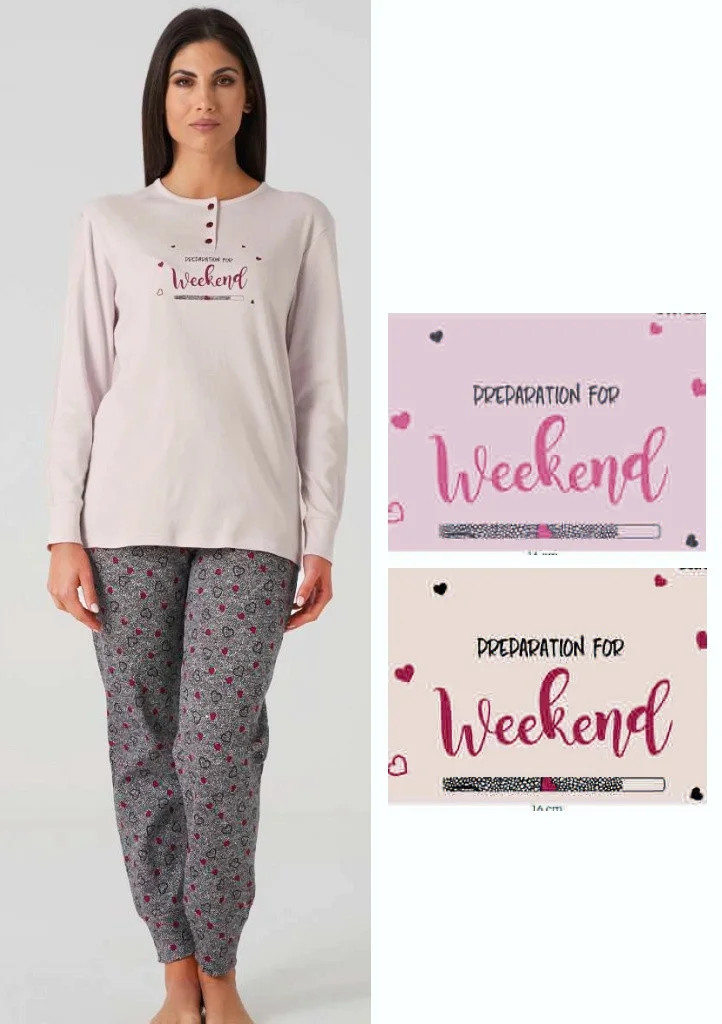 Dívčí pyžamo italské značky Karelpiu. Pyžamo se skládá ze dvou dílů. Tričko má dlouhý rukáv, který je ukončený do manžety. Spodní část je volná, tričko má kulatý výstřih s légou se třemi knoflíky. Na přední straně je natištěný nápis. Kalhoty jsou v pase do pohodlné, pružné gumy. Nohavice jsou ukončené do pružné manžety. Kalhoty jsou celé potištěné srdíčkami. Pyžamo je ušité z pohodlné, hřejivé bavlny.