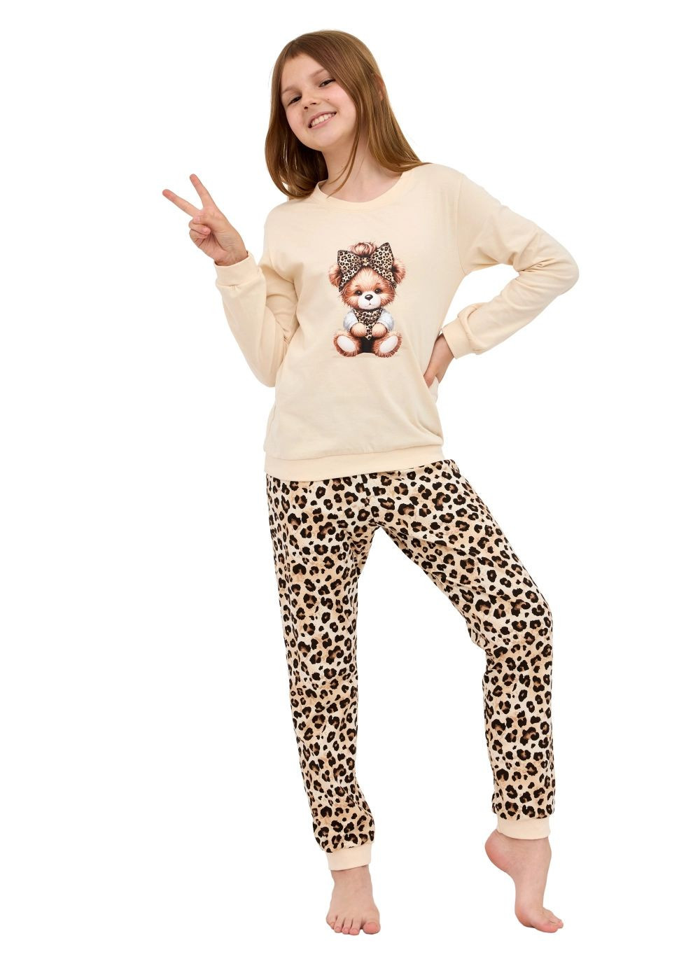 Dívčí pyžamo 592/191 Panther CORNETTE - z vysoce jakostní bavlny - béžové tričko s dlouhými rukávy - kulatý výstřih - přední strana ozdobená potiskem - dlouhé vzorované nohavice zakončené stahovacím lemem