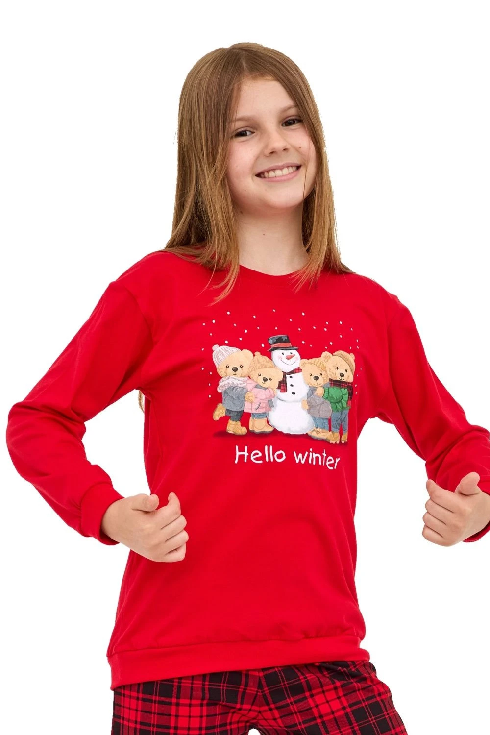 Dívčí pyžamo 592/185 Winter CORNETTE - z vysoce jakostní bavlny - červené tričko s dlouhými rukávy - kulatý výstřih - přední strana ozdobená potiskem - dlouhé kárované nohavice zakončené stahovacím lemem