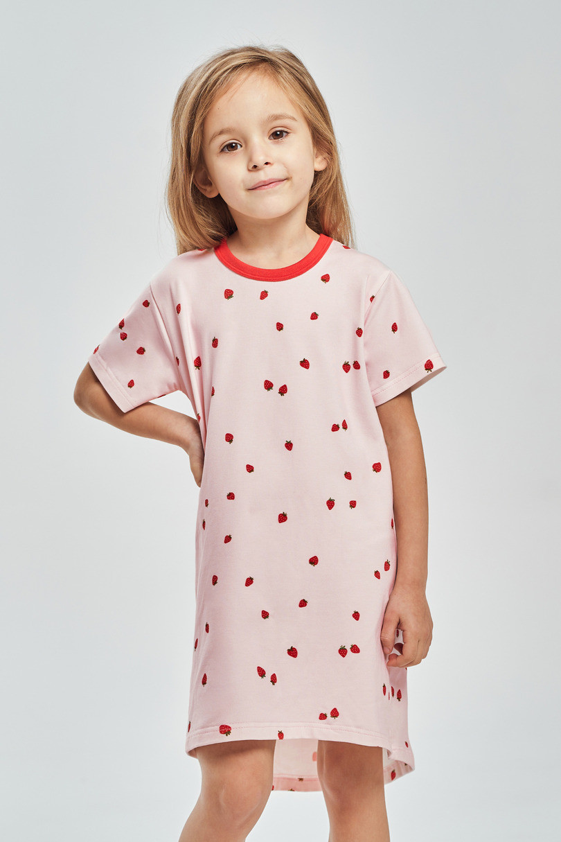 Model posiada krótki rękaw, który doskonale sprawdzi się w cieplejsze dni. Koszula została ozdobiona delikatnym wzorem nadającym jej bajkowego, dziewczęcego charakteru. Długość przed kolano gwarantuje swobodę ruchów i wygodę noszenia.