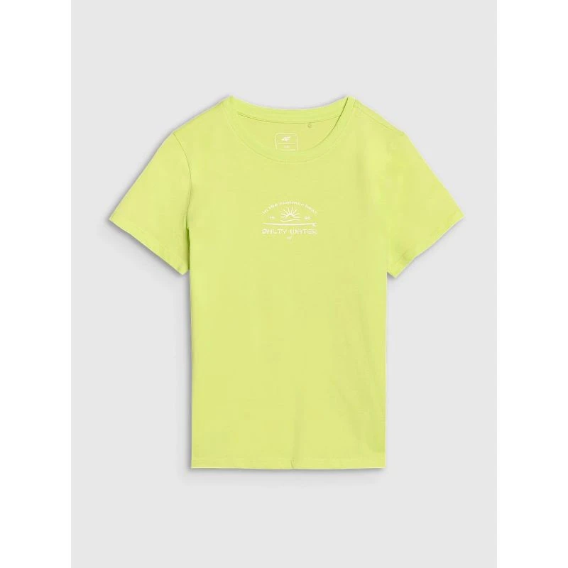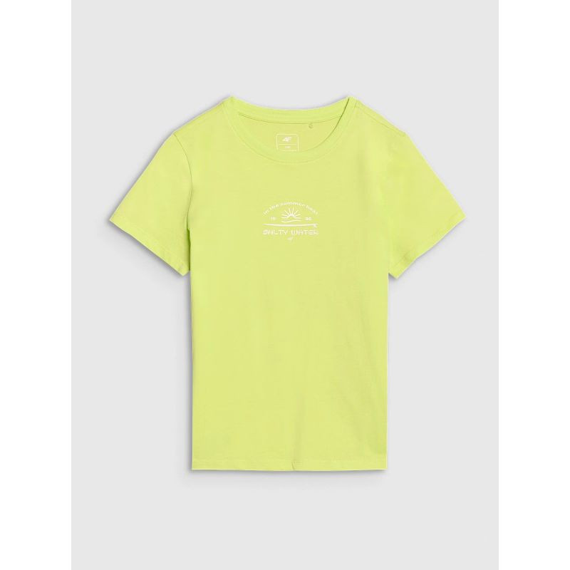 T-shirt dziewczęcy 4Fjest wykonany w 100% z bawełny, co gwarantuje wysoki komfort, trwałość i przyjemność noszenia. Okrągły dekolt wykończony jest lekkim ribem, a nadruk z motywem surferskim dodaje energii i letniego stylu.