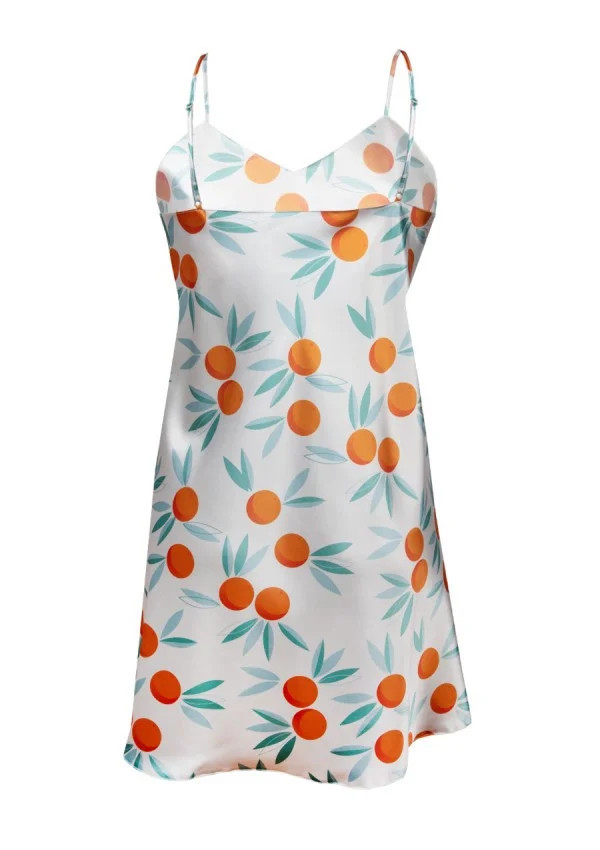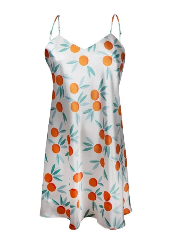 Krásná klasická noční košilka ze vzorovaného saténu. S tenkými nastavitelnými ramínky, díky nimž horní část košilky vypadá lehce a odhaluje ramena. Výstřih do V. Střih je volný, vzdušný, ženský a velmi pohodlný. Složení: 100% polyester.