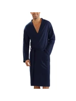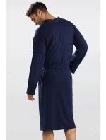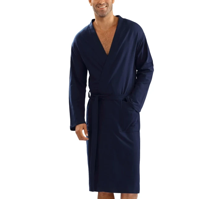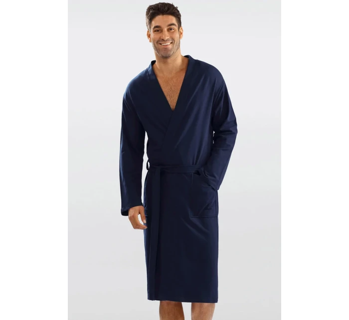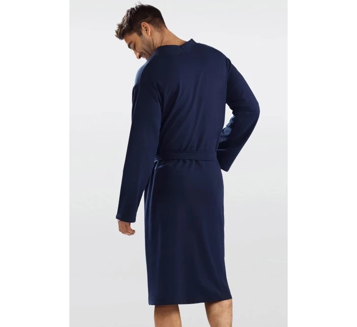 Klasický pánský župan. Příjemný měkký úplet, šálový límec zakončený lemováním v kontrastní barvě, ozdobná výšivka na hrudi, zavazování v pase, pohodlné kapsy na bocích.