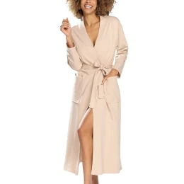 Nocna marki Dkaren. Model Melissa. Produkt został wykonany z 95% bawełna, 5% elastan. Posiada kieszenie. Produkt damski. Długość: długie. Miejsce zapięcia: przód. Nocna zapinany na wiązane. Długość rękawa: długi rękaw.