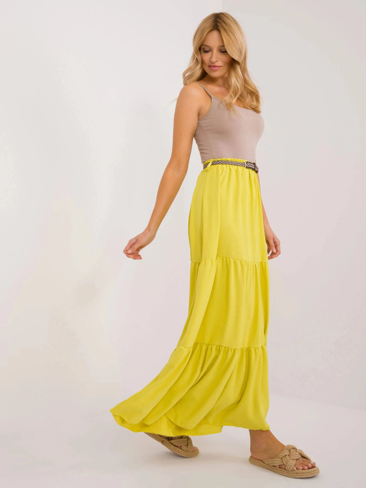 Sukně má v pase gumu a opasek. Model má délku maxi.