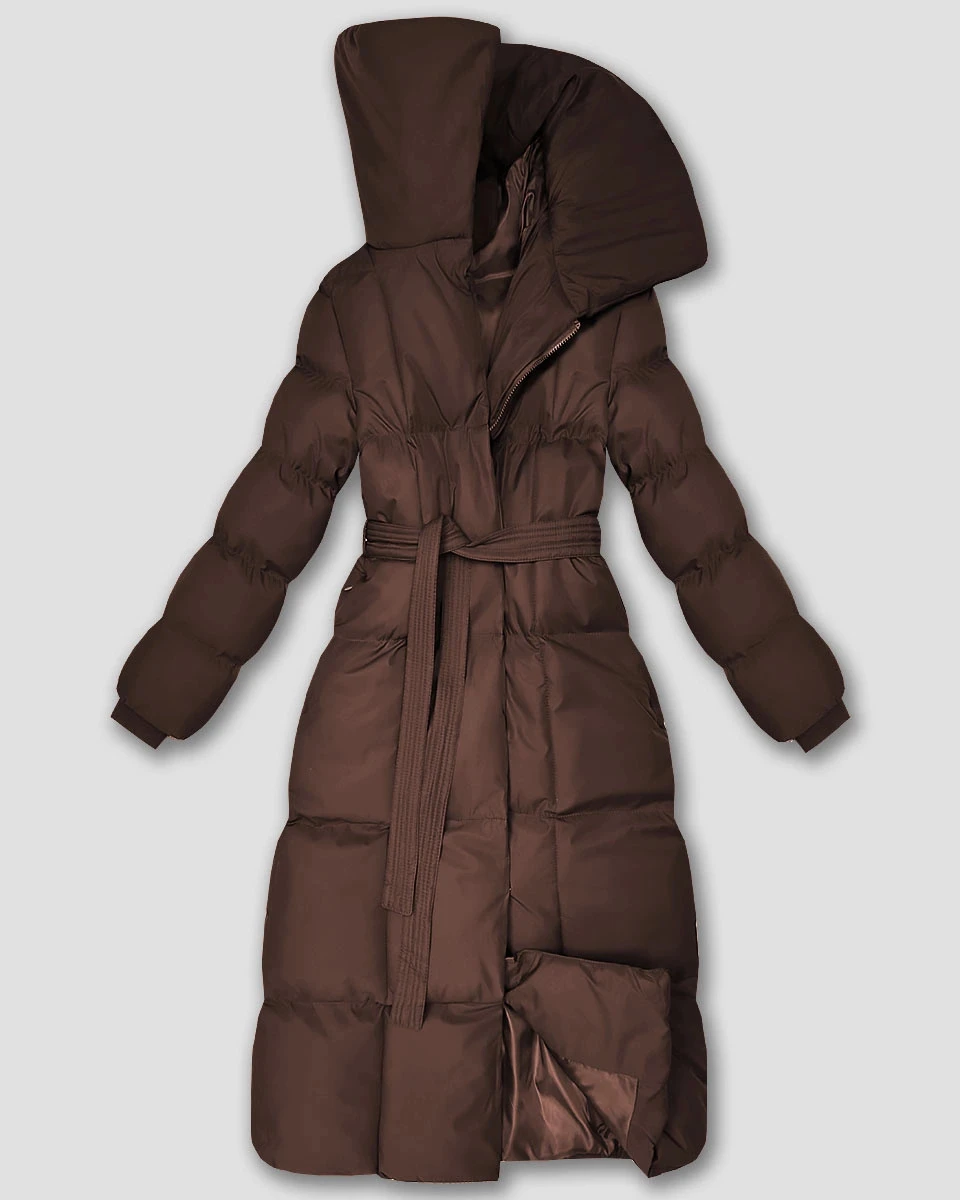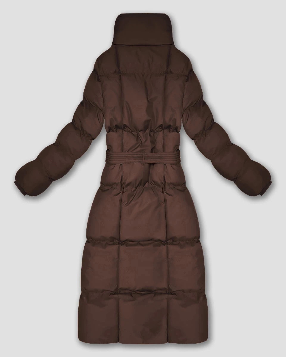 Dlouhá dámská zimní bunda v čokoládové barvě s páskem model 21748250 - J.STYLE