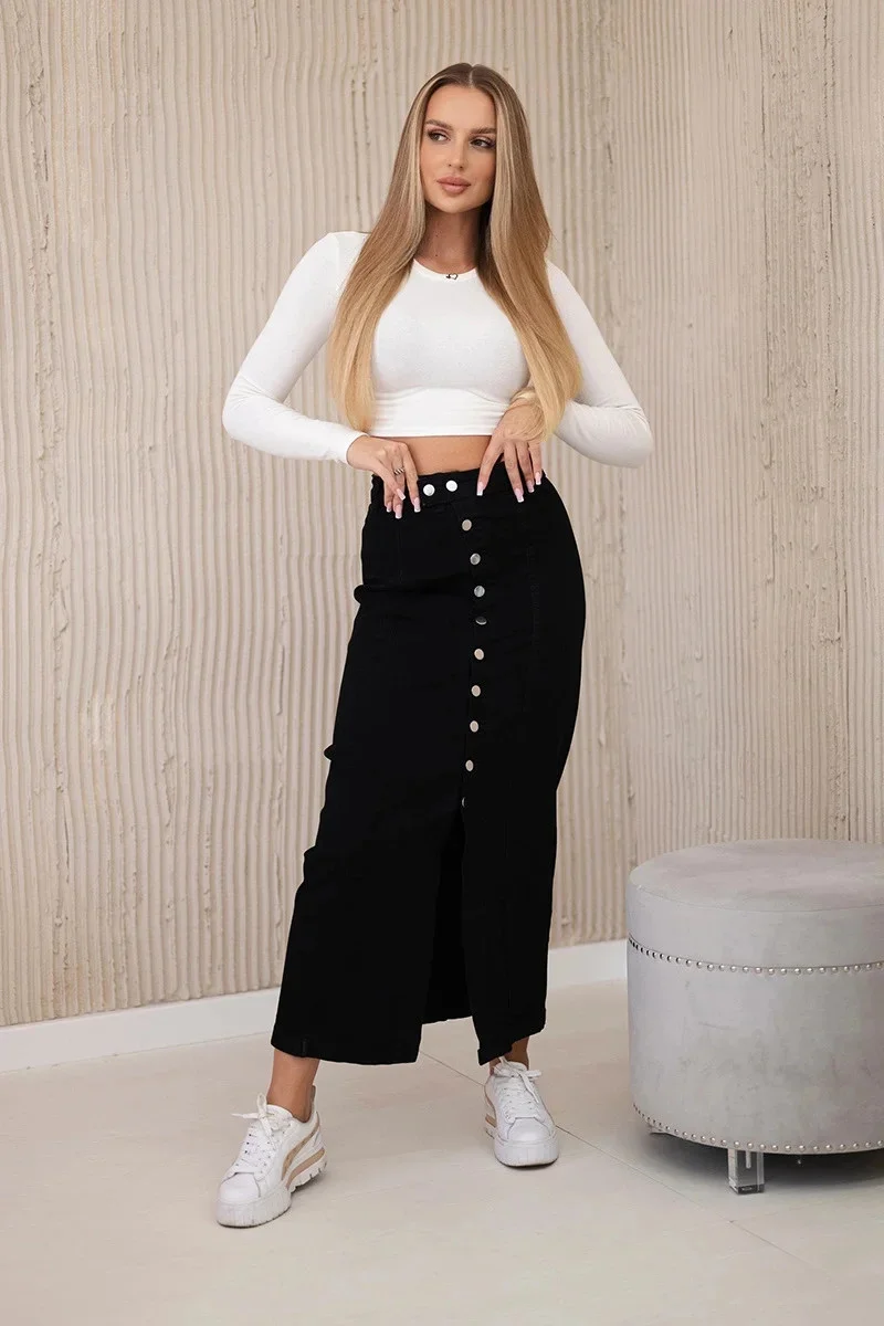 Dlouhá džínová sukně na knoflíky je klasický a všestranný kus oblečení, který kombinuje eleganci s ležérním stylem. Vyrobeno z vysoce kvalitní džínoviny, zajišťuje odolnost a pohodlí při nošení. Dlouhý střih jí dodává elegantní charakter a knoflíky vpředu jsou módním akcentem, který usnadňuje oblékání a svlékání sukně. Tato sukně je ideální pro různé příležitosti, od každodenního vzhledu až po formálnější příležitosti, a dokonale se hodí k topům, košilím a svetrům a vytváří elegantní a pohodlné outfity. Dostupné velikosti XS, S, M, L.