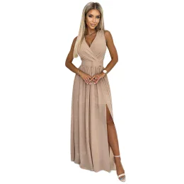 Dlouhé béžové dámské šaty s výstřihem a zavazováním model 18409723 - numoco