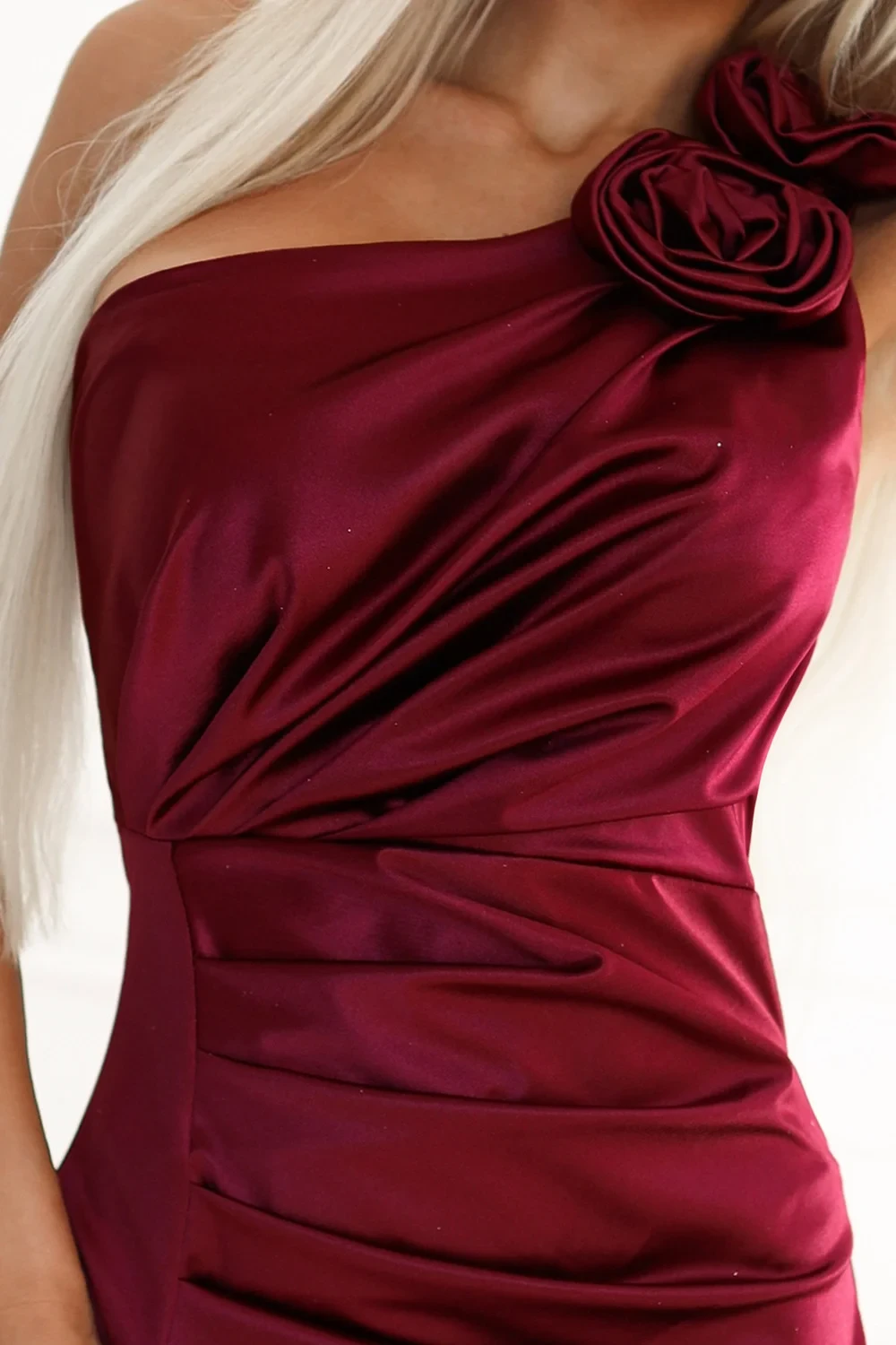 Šaty jsou na rameni ozdobené pěknými růžemi, které modelu dodávají výjimečný vzhled. Model má na noze rozparek a v pase a na poprsí má drapování, které zvýrazňuje postavu a dodává šatům na eleganci. Šaty jsou ušité z velmi kvalitního saténového materiálu v hluboké vínové bordó barvě. Model je vhodný pro zvláštní a slavnostní příležitosti. Šaty jsou polským výrobkem.