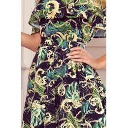 Tyto šaty značky Numoco jsou polským výrobkem a jsou k dostání v černé barvě se vzorem zelených listů a zlatých řetízků.