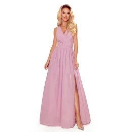 Dlouhé dámské šaty v pudrově růžové barvě s výstřihem a zavazováním model 17002029 - numoco