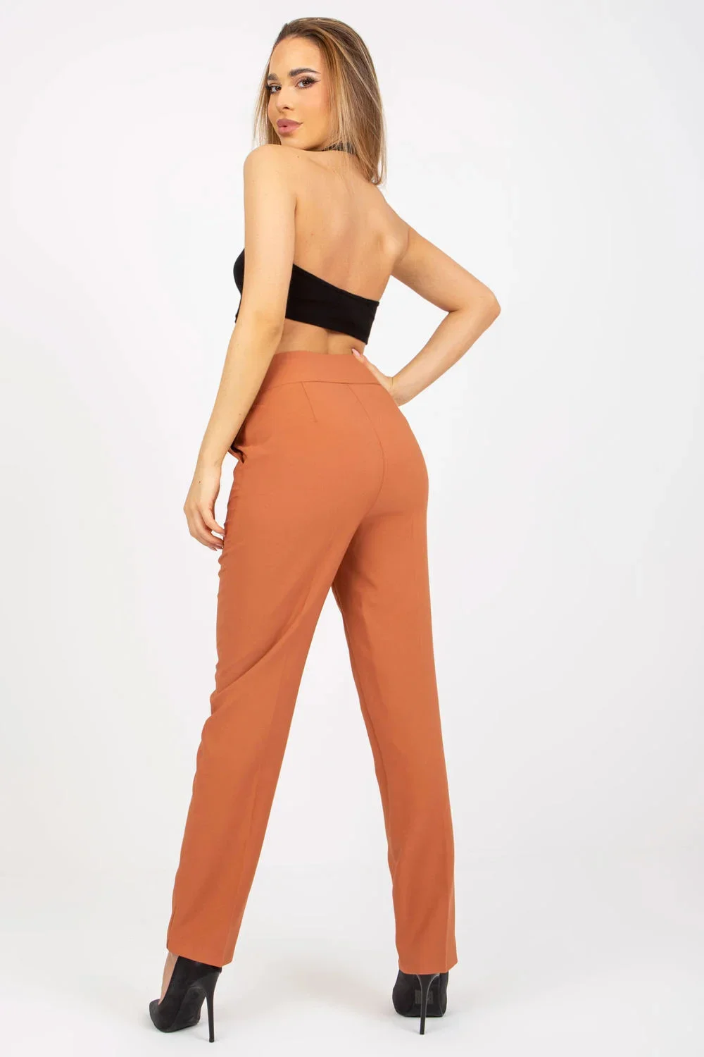 Dámské dlouhé kalhoty s rovnými nohavicemi a vysokým sedem. Kalhoty se zapínají na zip a knoflíky. V pase našitý pásek. Vsazené kapsy na bocích.