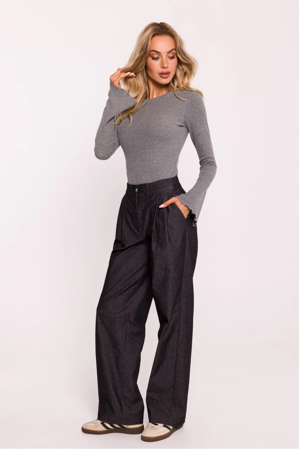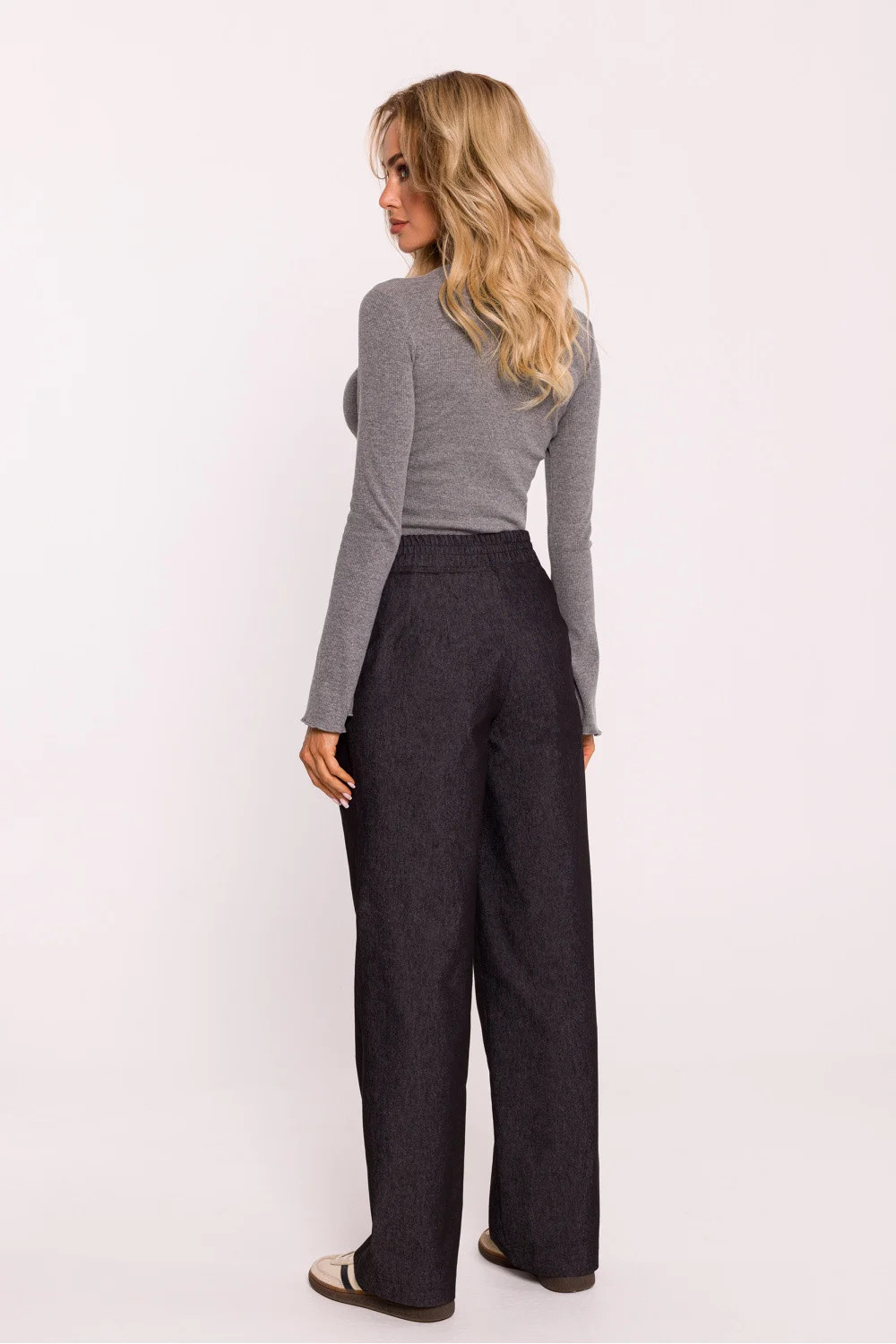 Stylové dámské kalhoty vyrobené z vysokokvalitní bavlněné látky. Vyznačují se širokými nohavicemi, které zajistí pohodlí a elegantní vzhled, a záložkami v pasu, které jemně zdůrazňují postavu. V pase je elastická guma, což zaručuje pohodlí a ideální přizpůsobení. Kalhoty se zapínají na knoflík a zip, což přidává praktičnost. Lícové kapsy nabízejí další funkcionalitu. Navrženy a ušity v Polsku, spojují moderní design s vynikajícím řemeslem.