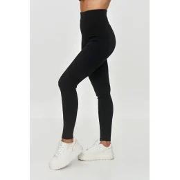 Elastické legíny jsou jedním z nezbytných prvků ženského šatníku. Jejich přiléhavý střih dokonale zdůrazňuje a zúžuje postavu. Materiál legín je měkký, elastický a jemně pruhovaný, co zajišťuje maximální pohodlí nošení a přizpůsobení tělu. Model sahá až po kotníky a vysoký pas zdůrazňuje pas, co dodává stylizaci eleganci. Navíc je v pasu vsazena široká elastická guma. Tento druh kalhot je ideální pro každodenní styly, kde mohou být nošeny jak s oversized mikinami, tak s přiléhavými topy. Celkový vzhled je moderní a minimalistický, a černá barva legín dobře ladí s různými barvami obuvi. Bavlna 90 %