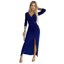 Přidání recenze k Dlouhé lesklé dámské šaty v chrpové barvě s výstřihem a rozparkem na noze model 19368537 - numoco
