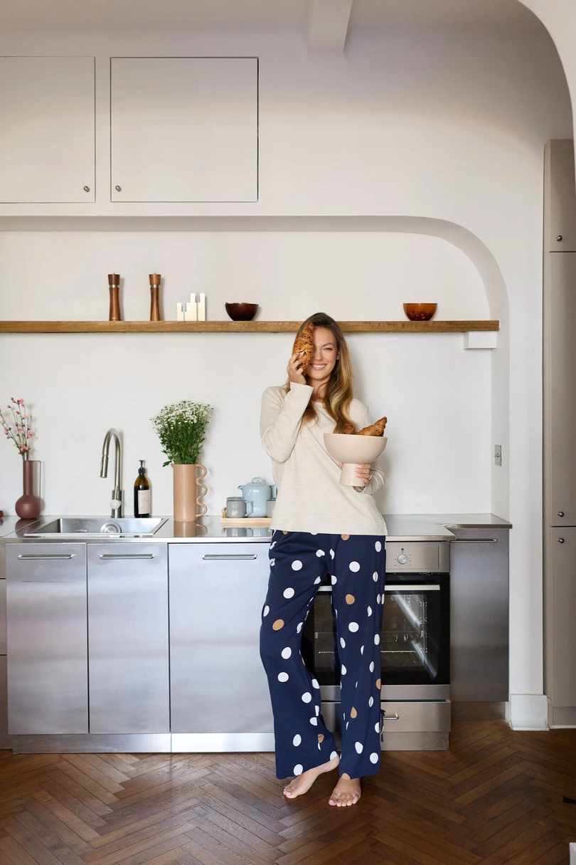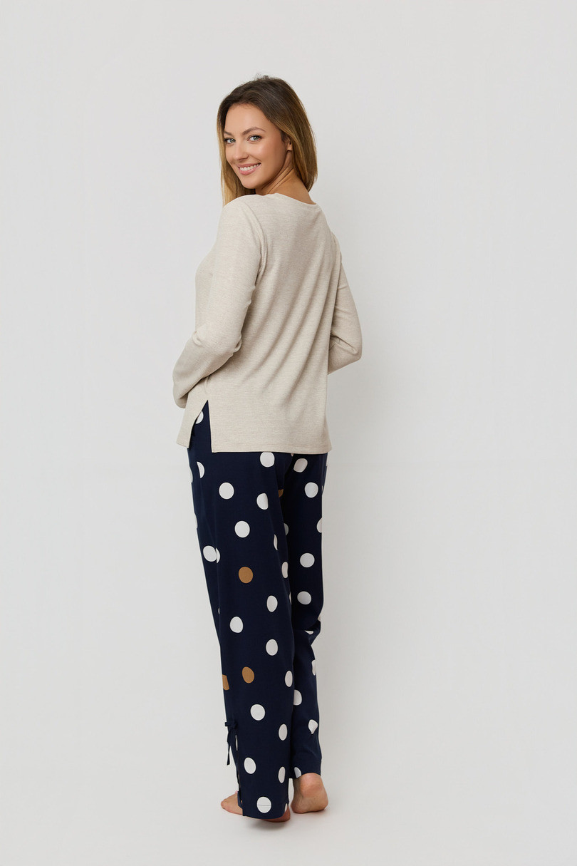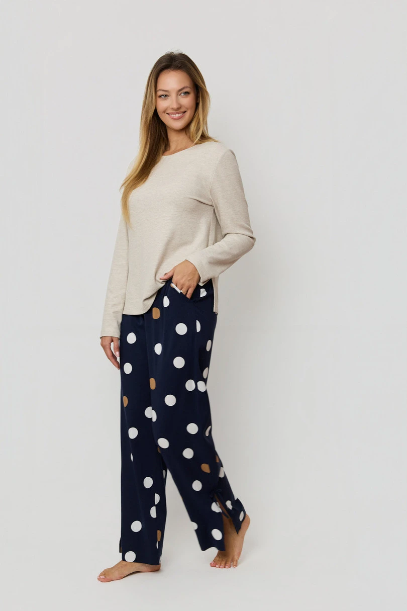 Elegancka i niezwykle kobieca piżama damska Oceane to idealne połączenie wygody, stylu i jakości. Wykonana z miękkiej wiskozy, zapewnia komfort i swobodę ruchów przez całą noc. Górna część zestawu to prążkowana koszulka z długim rękawem, okrągłym dekoltem i subtelnymi rozcięciami po bokach. Do kompletu dołączone są długie spodnie z wiskozowej tkaniny, ozdobione modnym printem w grochy. Spodnie posiadają kieszenie na biodrach oraz rozcięcia u dołu nogawek, zakończone uroczymi kokardkami. Całość prezentuje się stylowo i elegancko, doskonale sprawdzając się zarówno do snu, jak i domowego relaksu.