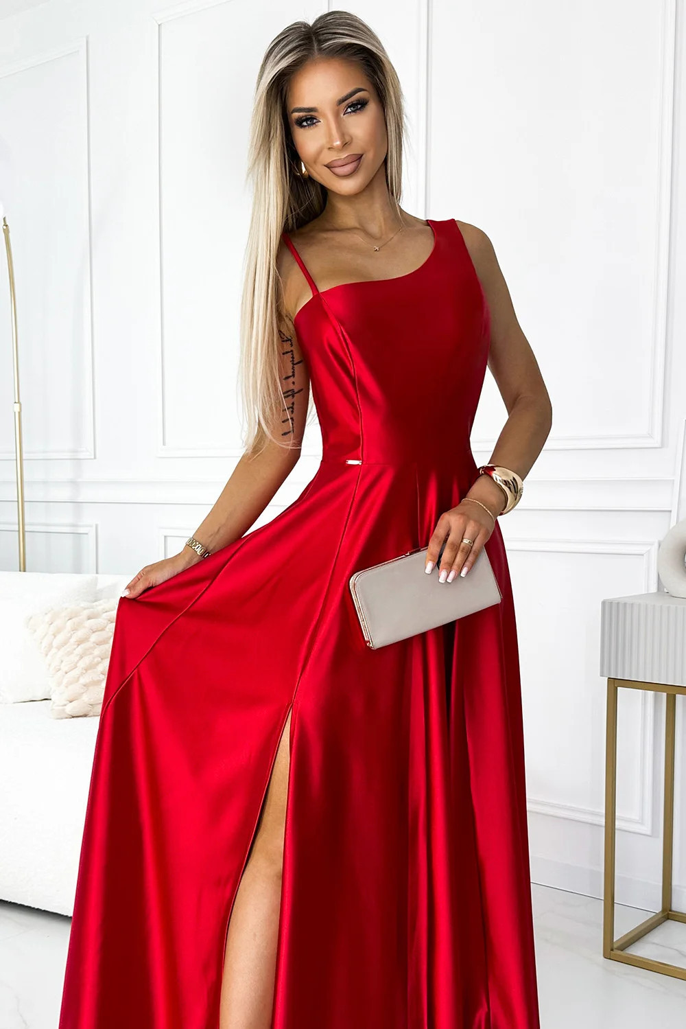 Elegantní maxi dlouhé saténové šaty na jedno rameno. Vyrobené z lesklého, hladkého, mírně elastického saténu v červené barvě. Šaty se skvěle hodí na svatbu, Silvestra, ples, karneval a další významné události. Polská výroba, značka Numoco.