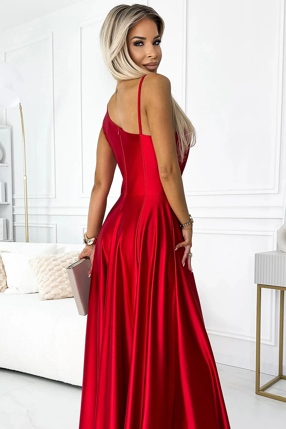 Dlouhé saténové šaty 524-1 červené - Numoco
