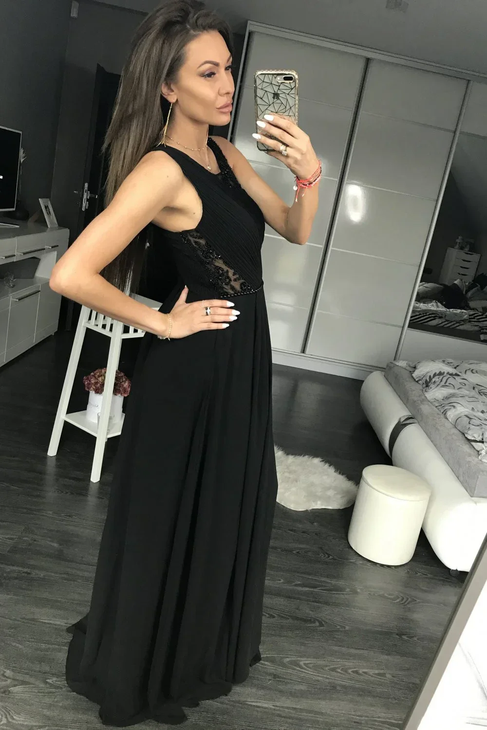 Dlouhé éterické šaty v černé barvě. Horní část zdobená krajkou. Perfektní nabídka pro mnoho příležitostí.